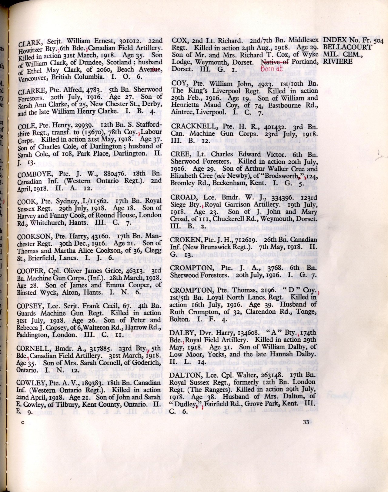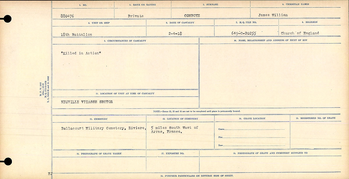 Family Search: When Private James William Comboye was born on 27 January 1898, in Blenheim, Kent, Ontario, Canada, his father, James W. Comboye, was 39 and his mother, Elizabeth Comboye, was 28. He registered for military service in 1916. In 1915, at the age of 17, his occupation is listed as farmer in Blenheim Township, Oxford, Ontario, Canada. He died on 2 April 1918, in Neuville-Vitasse, Pas-de-Calais, Nord-Pas-de-Calais, France, at the age of 20, and was buried in Neuville-Vitasse, Pas-de-Calais, Nord-Pas-de-Calais, France.