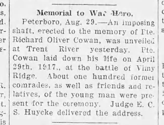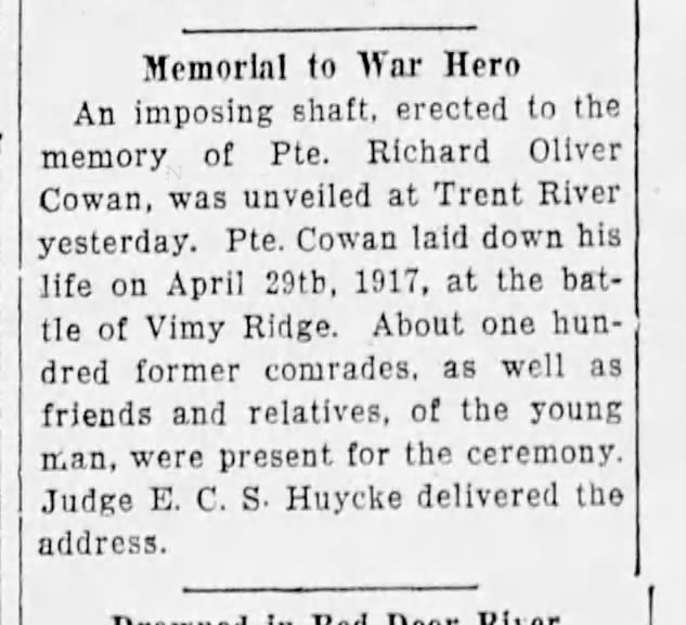 Family Search: When Private Richard Oliver Cowan was born on 11 January 1891, in Trent River, Trent Hills, Northumberland, Ontario, Canada, his father, Joseph Cowan, was 35 and his mother, Victoria Pomeroy, was 33. He lived in Ontario, Canada, in 1892 and in Northumberland, Ontario, Canada, for about 10 years. He registered for military service in 1916. In 1916, at the age of 25, his occupation is listed as farmer in Trent River, Northumberland, Ontario, Canada. He died on 9 April 1917, in Thélus, Pas-de-Calais, France, at the age of 26, and was buried in Thélus, Pas-de-Calais, France.
