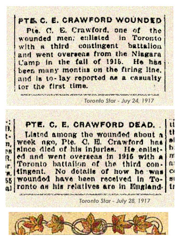 Listed among the wounded about a week ago, Pte. C.E. Crawford has since died of his injuries. He enlisted and went overseas in 1916 with a Toronto battalion of the third contingent. No details have been received in Toronto as his relatives are in England.