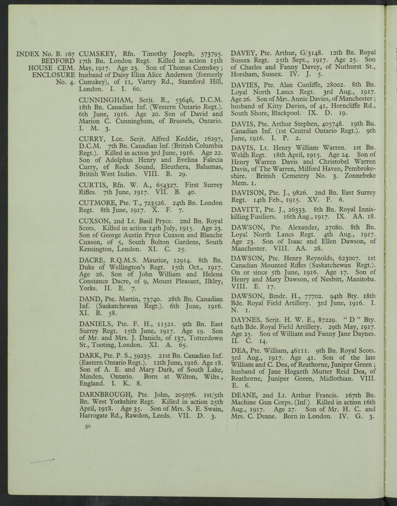 Family Search: When Sergeant Richard Cunningham was born on 11 May 1893, in McKillop Township, Huron, Ontario, Canada, his father, David Richard Cunningham, was 29 and his mother, Marion Catherines Wells, was 24. He registered for military service in 1914. In 1914, at the age of 21, his occupation is listed as farmer. He died on 6 June 1916, in Ieper, West Flanders, Belgium, at the age of 23, and was buried in Ieper, West Flanders, Belgium.