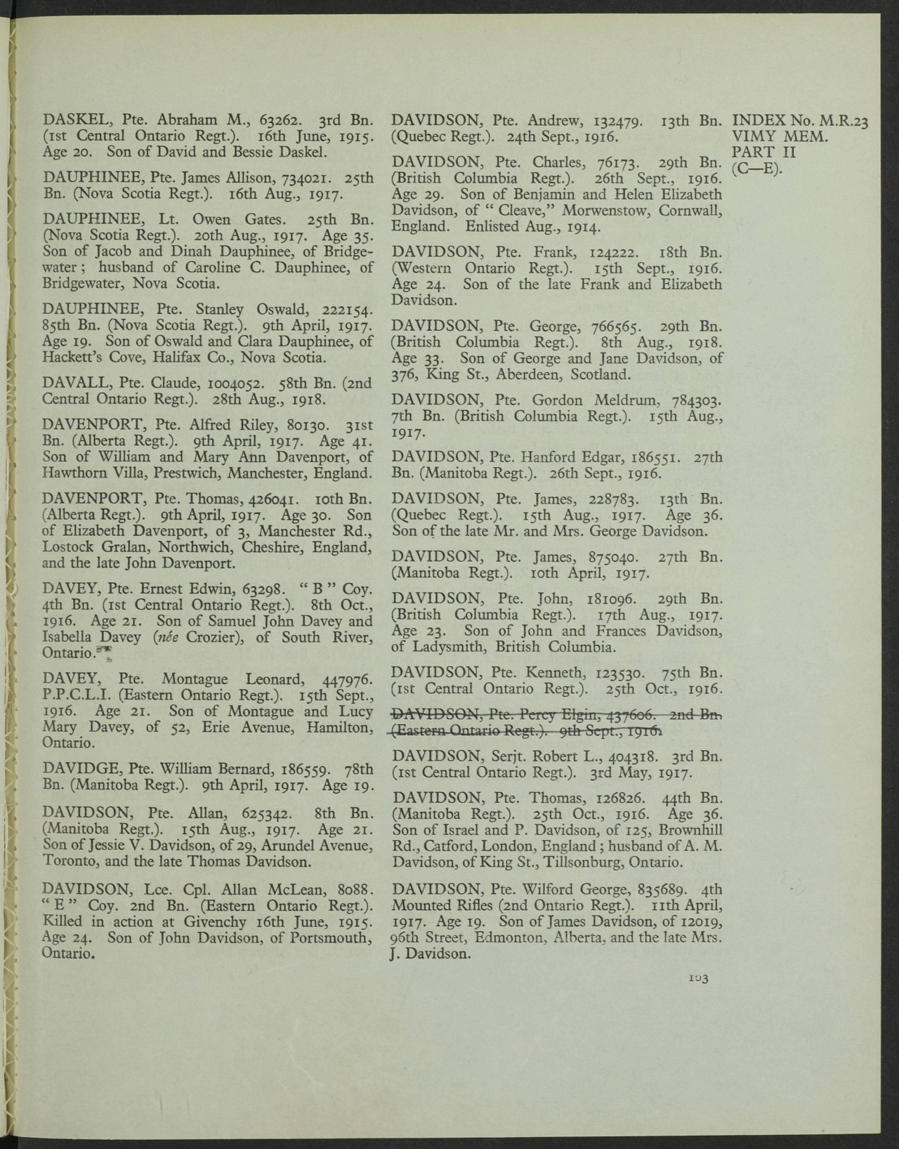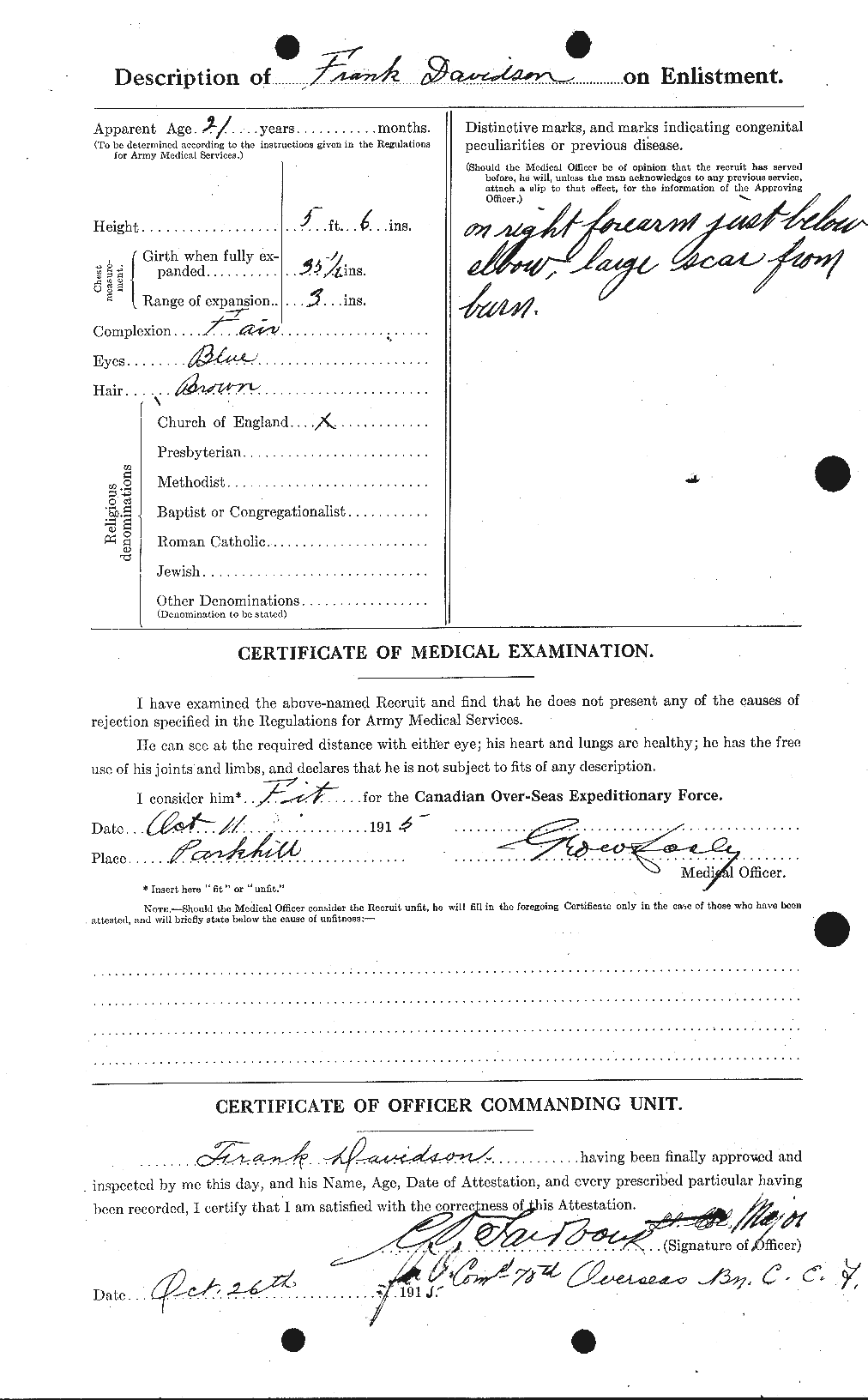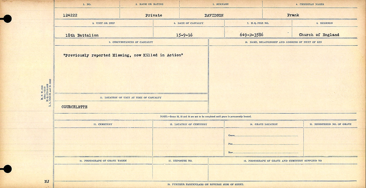 Family Search: Private Frank Davidson was born on 13 July 1894, in Stockton on Tees, North Yorkshire, England, United Kingdom as the son of Davidson. He immigrated to Quebec City, Quebec, Canada in 1908 and lived in Parkhill, North Middlesex, Middlesex, Ontario, Canada in 1915. He registered for military service in 1915. In 1915, at the age of 21, his occupation is listed as farmer in Parkhill, North Middlesex, Middlesex, Ontario, Canada. He died on 15 September 1916, in Courcelette, Somme, Picardie, France, at the age of 22.
