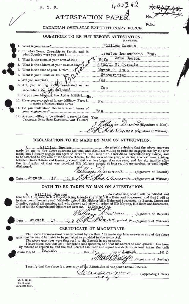 Family Search: Private William George Dawson was born on 9 March 1886, in Preston, Lancashire, England, United Kingdom as the son of John Dawson and Margaret Edmonds. He lived in Carleton, Lancashire, England, United Kingdom in 1911. He registered for military service in 1915. In 1915, at the age of 29, his occupation is listed as steamfitter in Toronto, Ontario, Canada. He died on 3 February 1919, in Toronto, Ontario, Canada, at the age of 32, and was buried in St John’s Norway Cemetery, Toronto, Ontario, Canada.
