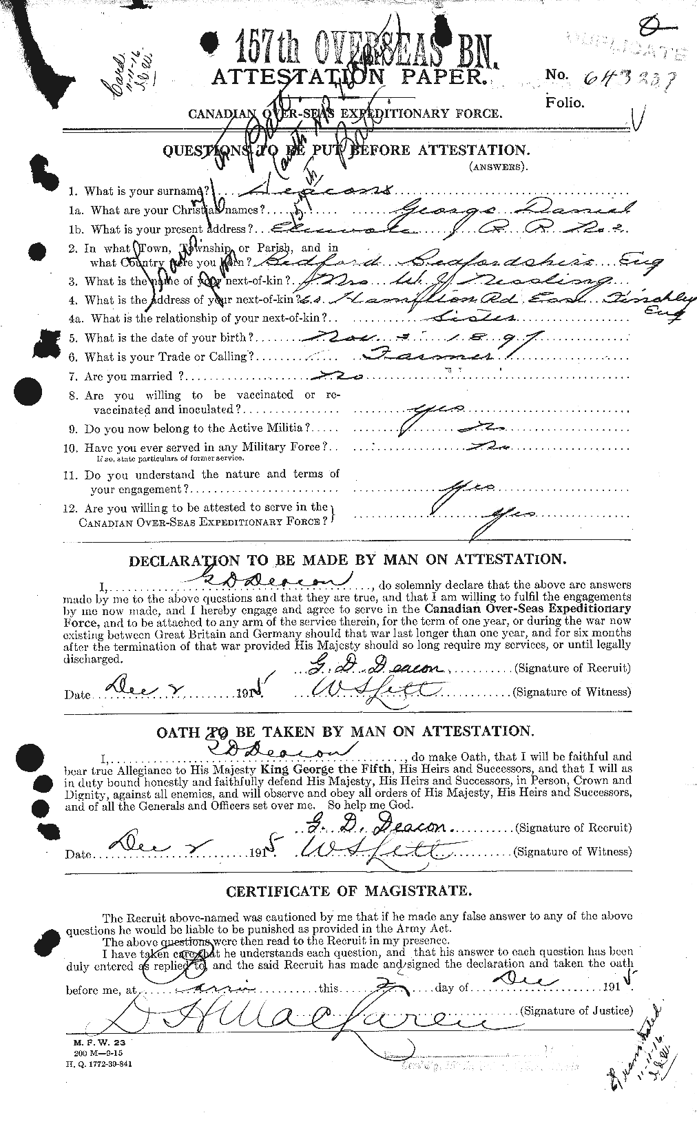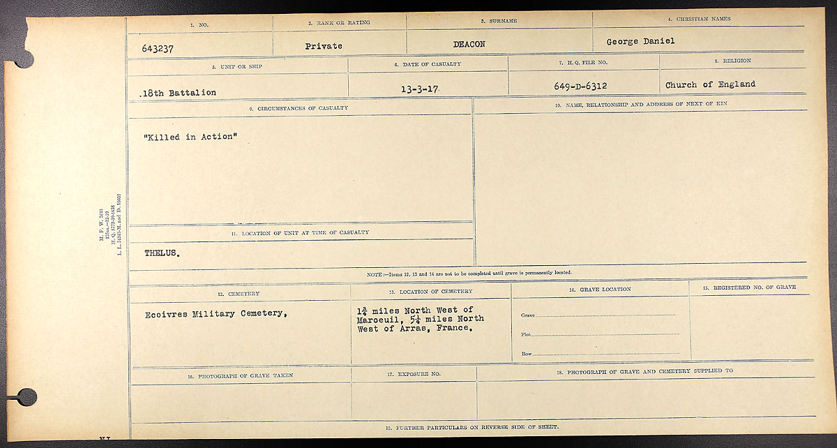 Deacon, George Daniel: Service no. 643237 CVWM Page CWGC Digitized Service Record Source: March 1917 casualty. Find-A-Grave “Killed in Action.” Share this: Click to email a link to a friend (Opens in new window) Email Click to share on Facebook (Opens in new window) Facebook Click to share on X (Opens in new window) X Click to share on Reddit (Opens in new window) Reddit Click to share on LinkedIn (Opens in new window) LinkedIn Click to print (Opens in new window) Print Click to share on Tumblr (Opens in new window) Tumblr Click to share on Pocket (Opens in new window) Pocket Click to share on Pinterest (Opens in new window) Pinterest Click to share on Telegram (Opens in new window) Telegram Click to share on WhatsApp (Opens in new window) WhatsApp Like Loading...