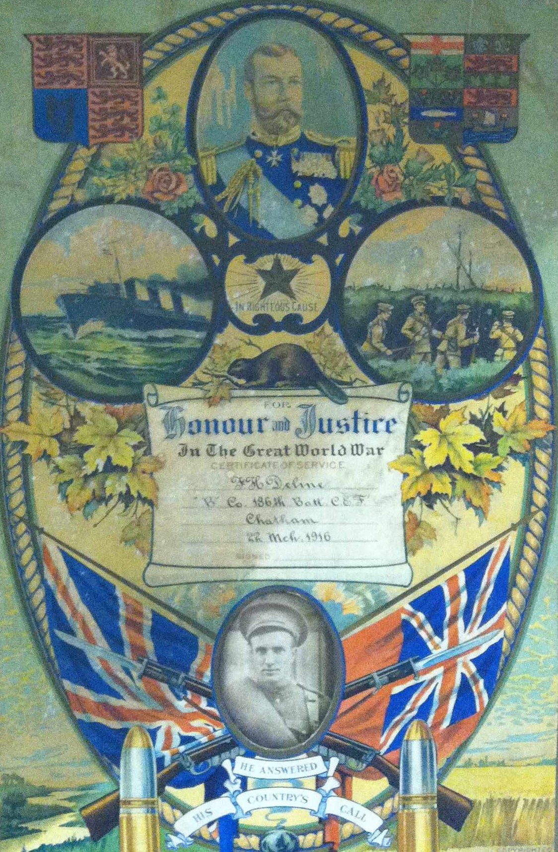 Family Search: When Private Fred Howard Deline was born on 29 August 1890, in Richmond, Ottawa-Carleton, Ontario, Canada, his father, George Edward Deline, was 34 and his mother, Charlotte Selina Thompson, was 33. He lived in Bothwell, Kent, Ontario, Canada in 1901 and Chatham, Kent, Ontario, Canada in 1916. He registered for military service in 1916. In 1916, his occupation is listed as labourer in Chatham, Kent, Ontario, Canada. He died on 27 August 1918, in Arras, Pas-de-Calais, Nord-Pas-de-Calais, France, at the age of 27, and was buried in Wancourt British Cemetery, Wancourt, Pas-de-Calais, Nord-Pas-de-Calais, France.