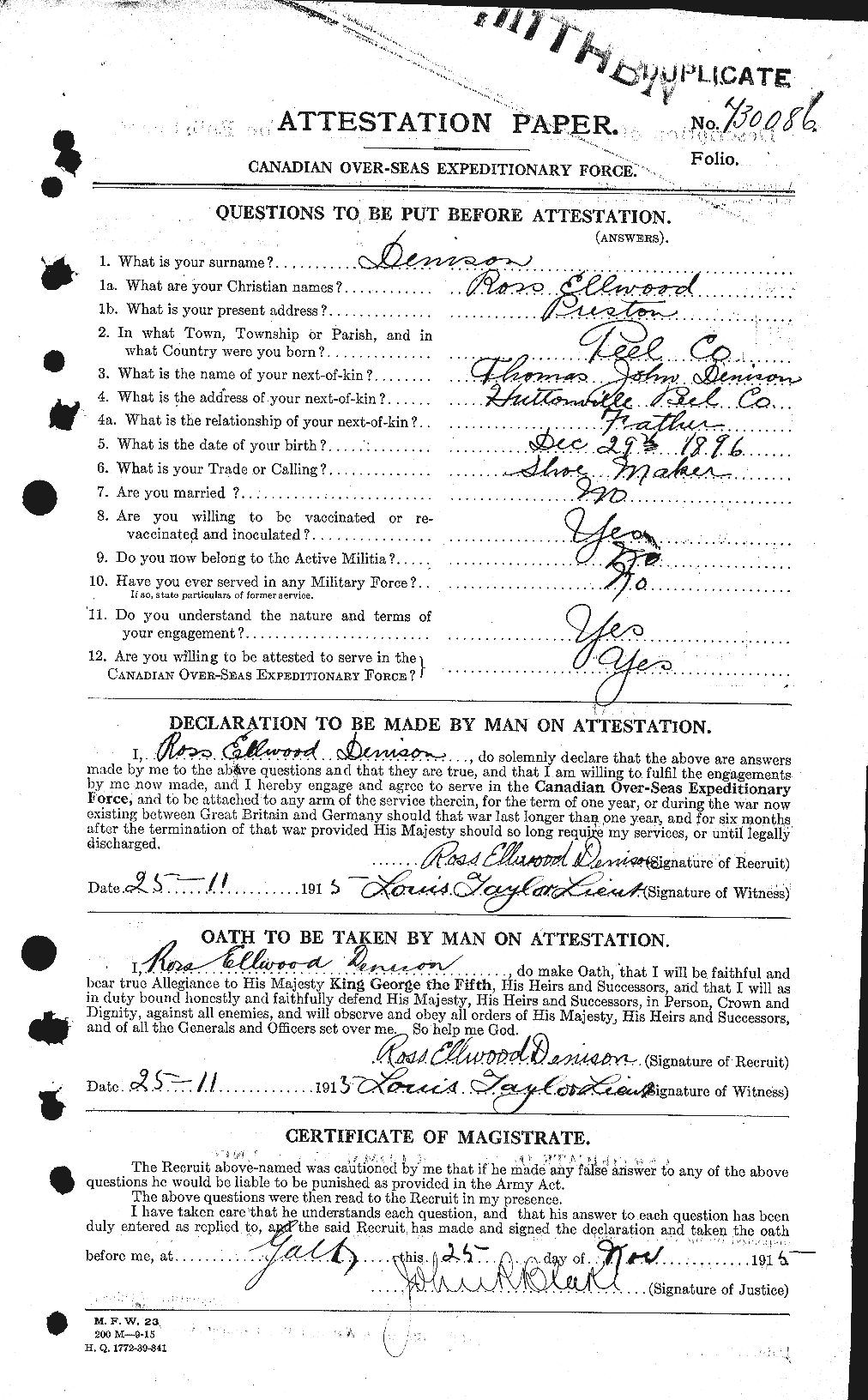 Private Ross Ellwood Denison. Regimental no. 730086.
