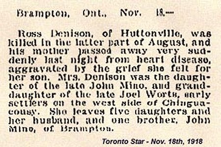 Ross Denison of Huttonville, was killed in the latter part of August, and his mother passed away very suddenly last night from heart disease, aggravated by the grief she felt for her son. Mrs. Denison was the daughter of the late John Mino, and grand-daughter of the late Joel Worts, early settlers on the west side of Chinguacosy. She leaves five daughters and her husband, and one brother, John Mino, of Brampton.