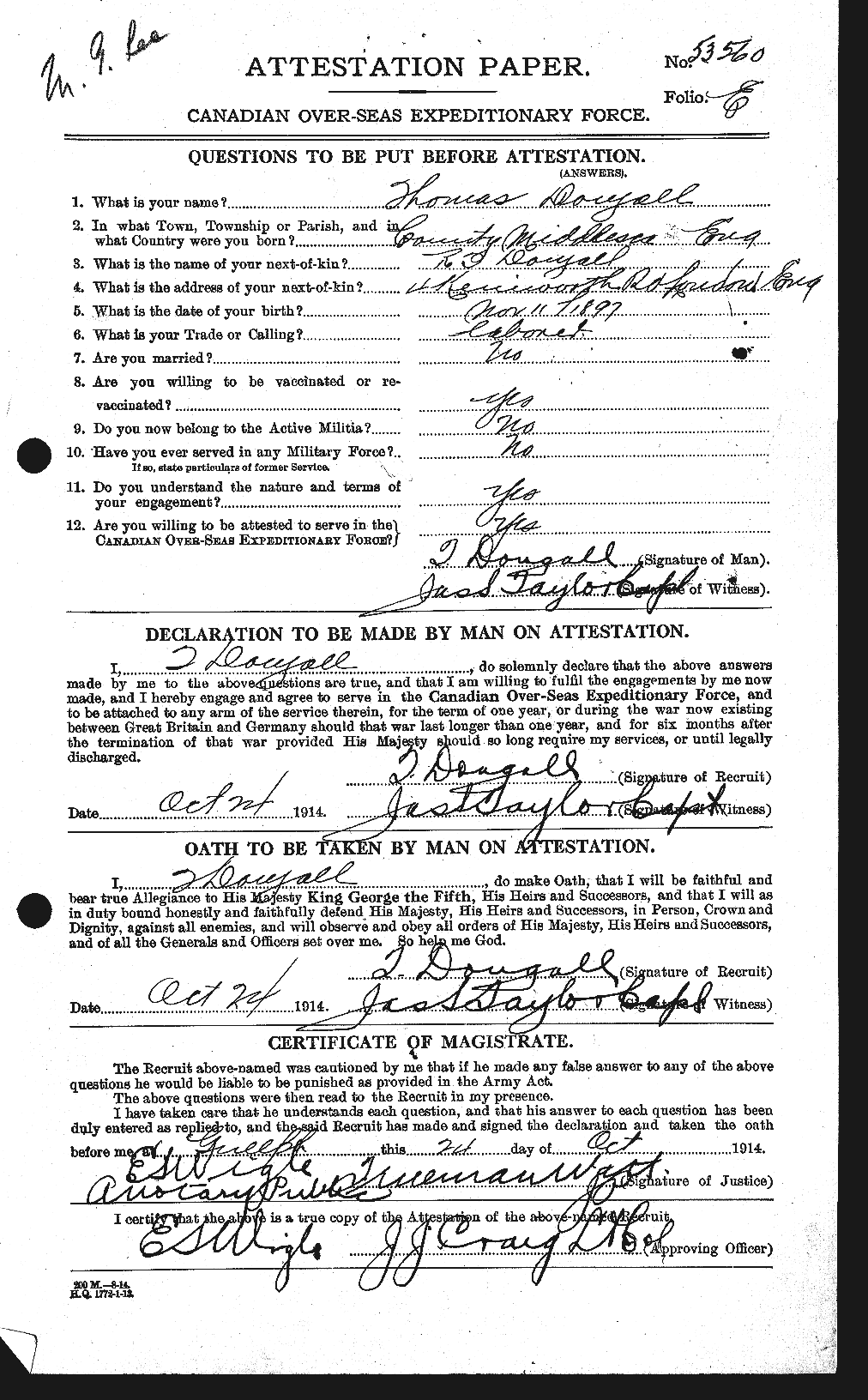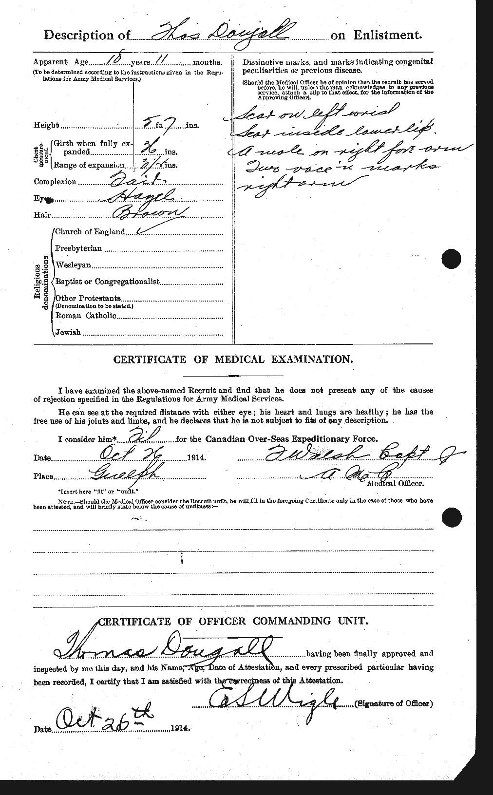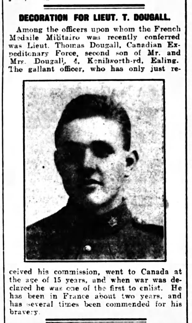 Thomas Dougall was born in England in 1897 but was a labourer residing in Guelph when he enlisted as a private in October 1914. By 1917, Dougall had been promoted to sergeant. In February of that year, he earned the Military Cross and the French Medaille Militaire “for conspicuous gallantry and devotion to duty. He made two valuable daylight reconnaissances into houses in no man’s land and discovered machine gun emplacements, dugouts and tunnels, as well as two trench mortar emplacements, upon which he was able to direct our artillery fire with great success.”