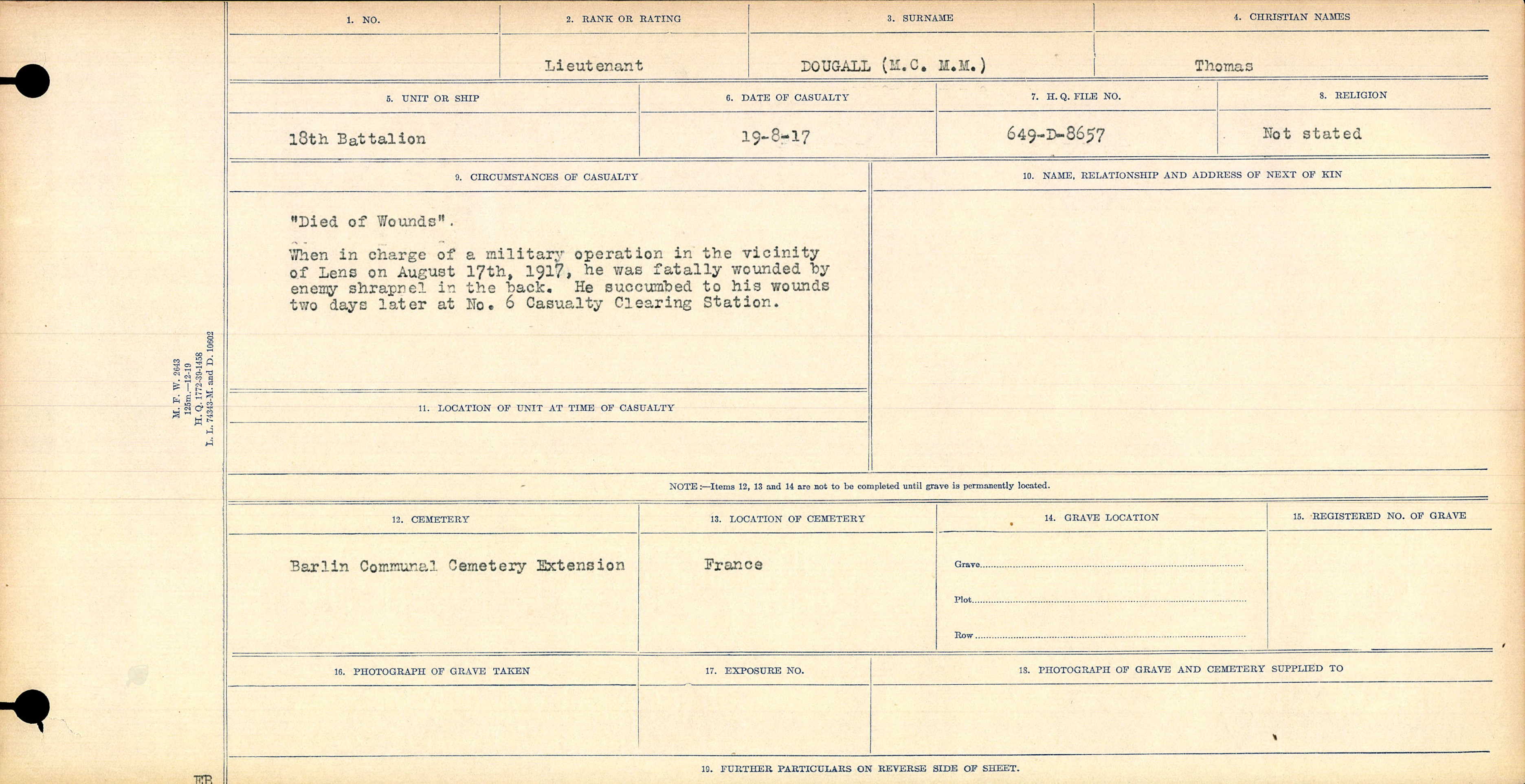 The 18th Battalion War Diary relates in an entry July 22, 1917: “During this tour LIEUT. T.R. DOUGALL rendered valuable service and obtained valuable information by making 3 daring reconnaissances among the buildings in NO MANS LAND. At M.19.a.70.00 and N.19.0.80.70 he searched these houses and German dugouts in the vicinity. 2 of these reconnaissances were made during daylight and from information gained he was able to direct artillery fire on T.M. [trench mortar] emplacements.”
