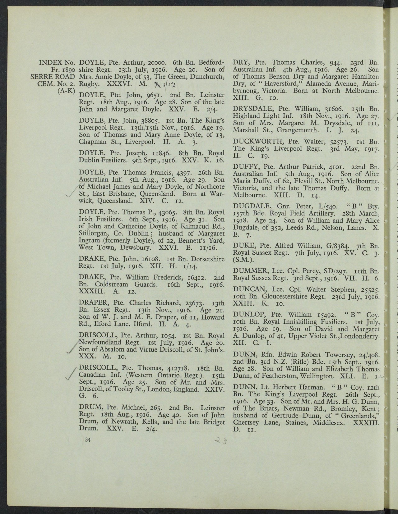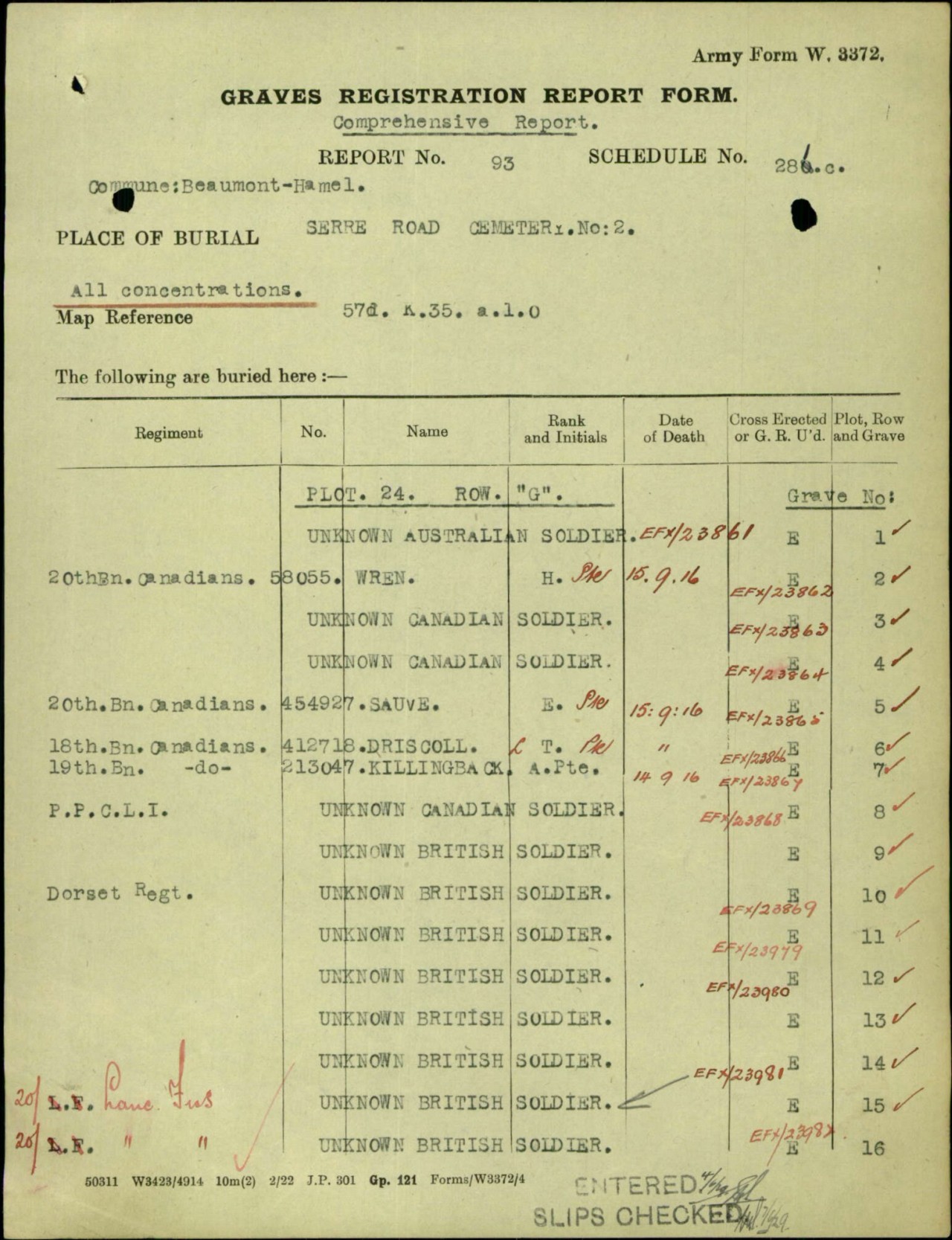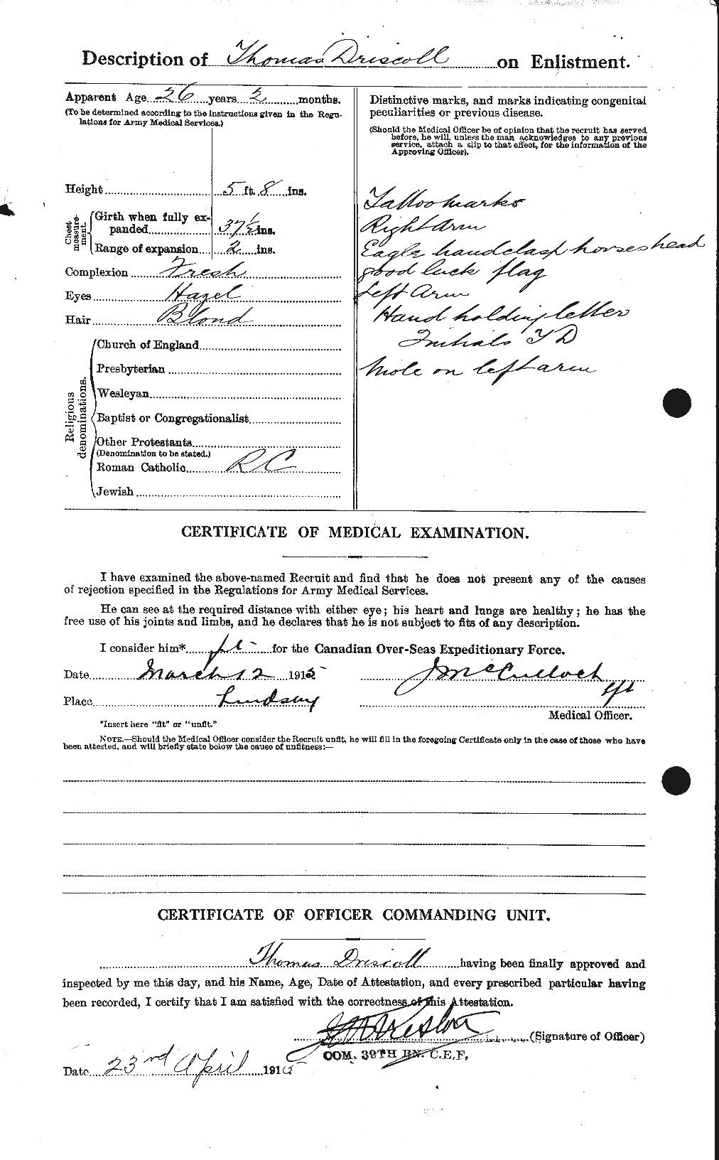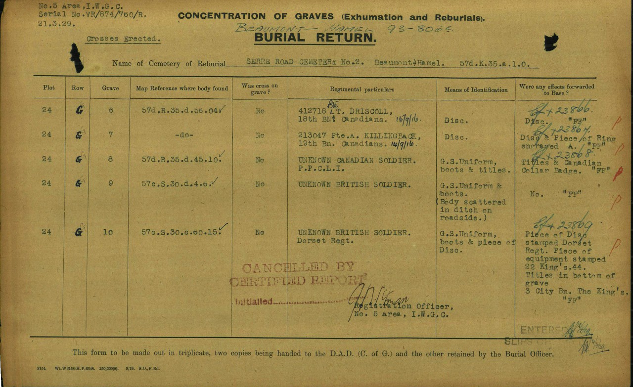 Family Search: Private Thomas Driscoll was born on 16 January 1889, in London, England, United Kingdom as the son of Father Driscoll and Mary Driscoll. He immigrated to Canada in 1913. He registered for military service in 1916. In 1916, at the age of 27, his occupation is listed as butcher. He died on 15 September 1916, in Courcelette, Somme, Picardie, France, at the age of 27, and was buried in Beaumont-Hamel, Somme, Picardie, France.