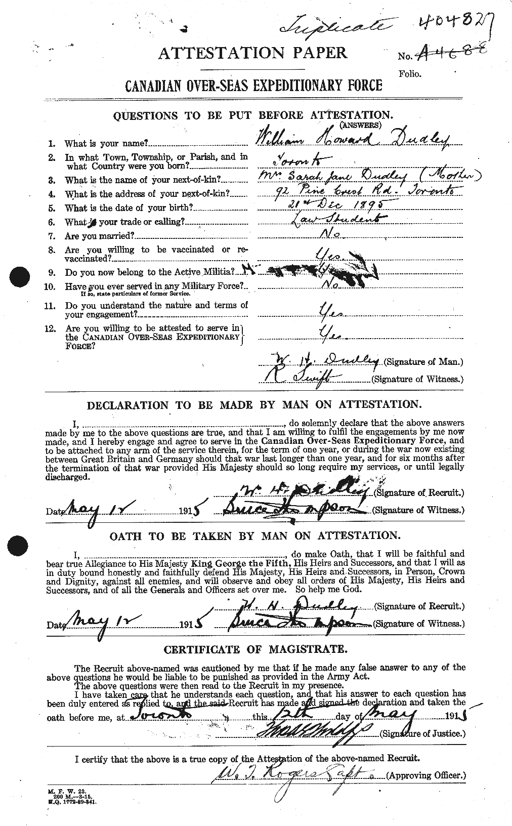 Family Search: When Private William Howard Dudley was born on 21 December 1895, in Toronto, Ontario, Canada, his father, Thomas Joseph Dudley, was 42 and his mother, Sarah Jane McLain, was 41. He registered for military service in 1915. In 1915, at the age of 20, his occupation is listed as law student in Toronto, Ontario, Canada. He died on 10 May 1916, in Étaples, Pas-de-Calais, Nord-Pas-de-Calais, France, at the age of 20, and was buried in Etaples Military Cemetery, Étaples, Pas-de-Calais, Nord-Pas-de-Calais, France.