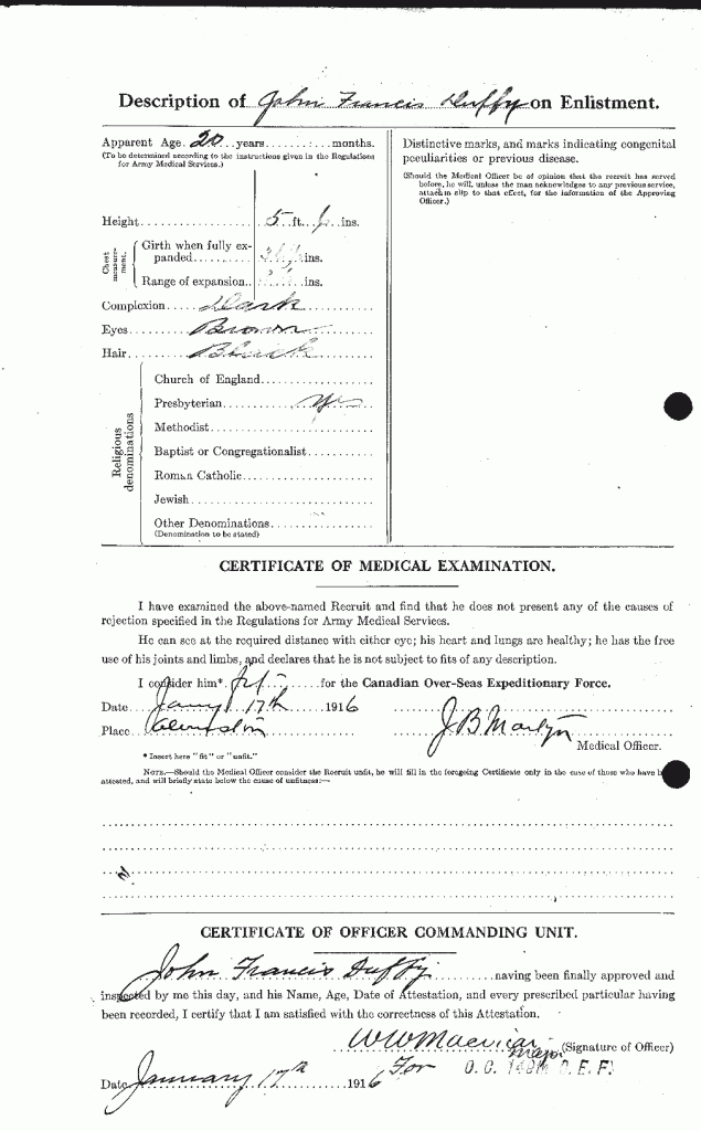 Family Search: When Private John Francis Duffy was born on 13 October 1895, in Alvinston, Lambton, Ontario, Canada, his father, John Duffy, was 29 and his mother, Margaret Bowie, was 30. He lived in Lambton, Ontario, Canada in 1901. He registered for military service in 1916. In 1916, at the age of 21, his occupation is listed as farmer in Alvinston, Lambton, Ontario, Canada. He died on 2 September 1918, in Mingoval, Pas-de-Calais, Nord-Pas-de-Calais, France, at the age of 22, and was buried in Aubigny Communal Cemetery Extension, Aubigny, Pas-de-Calais, Nord-Pas-de-Calais, France.