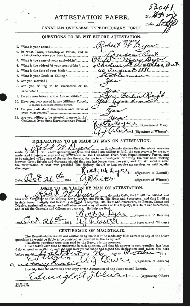 Dyer, Robert William: Service no. 53041 CVWM Page Digitized Service Record Find-A-Grave CWGC Page Source: Subject of a story as one of the series of “Memories” by the 18th Battalion Association. Dyer, Robert William: Service no. 53041 Share this: Click to email a link to a friend (Opens in new window) Email Click to share on Facebook (Opens in new window) Facebook Click to share on X (Opens in new window) X Click to share on Reddit (Opens in new window) Reddit Click to share on LinkedIn (Opens in new window) LinkedIn Click to print (Opens in new window) Print Click to share on Tumblr (Opens in new window) Tumblr Click to share on Pocket (Opens in new window) Pocket Click to share on Pinterest (Opens in new window) Pinterest Click to share on Telegram (Opens in new window) Telegram Click to share on WhatsApp (Opens in new window) WhatsApp Like Loading...
