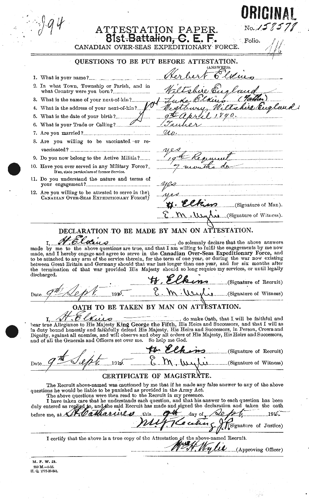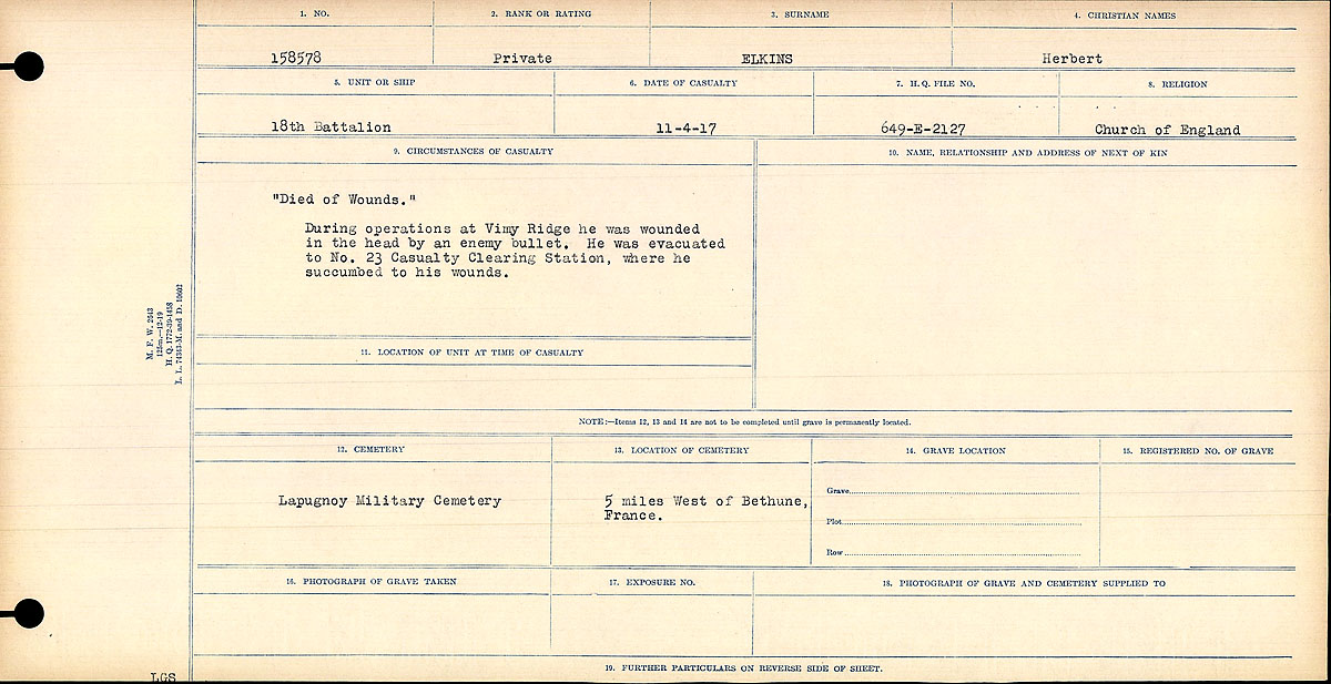 Elkins, Herbert: Service no. 158578 CVWM Page Digitized Service Record Source: April 1917 Casualty “Died of Wounds” During operations at Vimy Ridge he was wounded in the head by an enemy bullet. He was evacuated to No. 23 Casualty Clearing Station, were he succumbed to his wounds. Share this: Click to email a link to a friend (Opens in new window) Email Click to share on Facebook (Opens in new window) Facebook Click to share on X (Opens in new window) X Click to share on Reddit (Opens in new window) Reddit Click to share on LinkedIn (Opens in new window) LinkedIn Click to print (Opens in new window) Print Click to share on Tumblr (Opens in new window) Tumblr Click to share on Pocket (Opens in new window) Pocket Click to share on Pinterest (Opens in new window) Pinterest Click to share on Telegram (Opens in new window) Telegram Click to share on WhatsApp (Opens in new window) WhatsApp Like Loading...