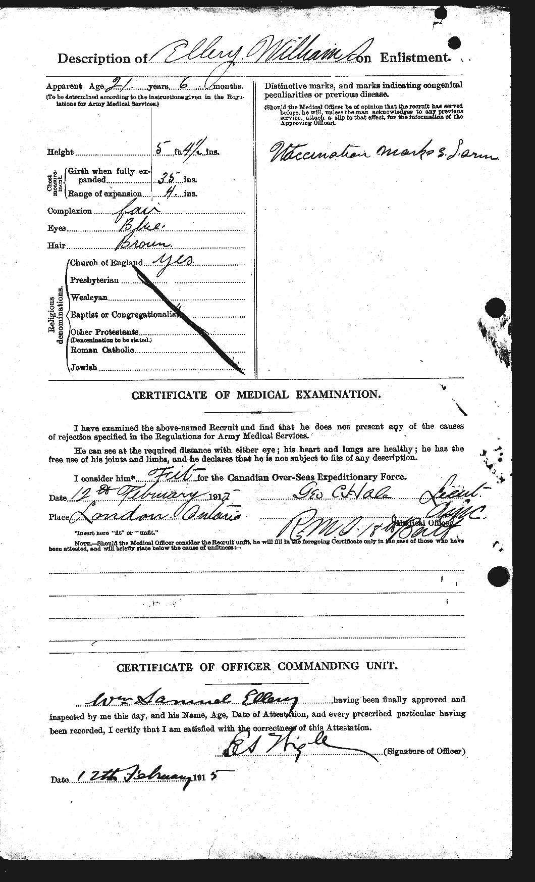 Family Search: Private William Samuel Ellery was born on 6 August 1893, in Southwark, London, England, United Kingdom as the son of George James Ellery and Mrs. Jane Ellery. He immigrated to Quebec City, Quebec, Canada in 1909. He registered for military service in 1915. In 1914, at the age of 21, his occupation is listed as farmer in Campbellton, Oxford, Ontario, Canada. He died on 14 September 1918, in Baralle, Pas-de-Calais, France, at the age of 25, and was buried in Vimy, Pas-de-Calais, Nord-Pas-de-Calais, France.