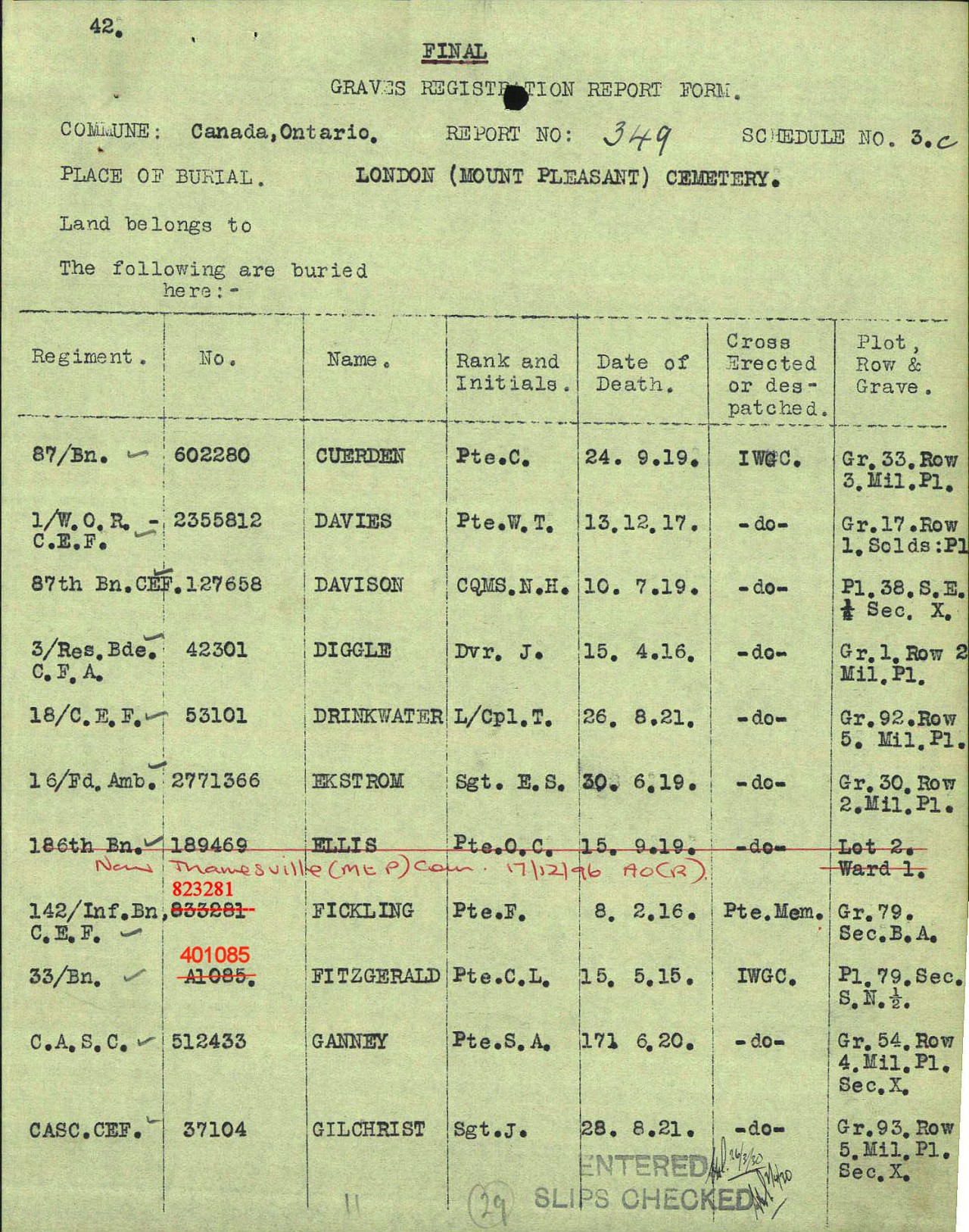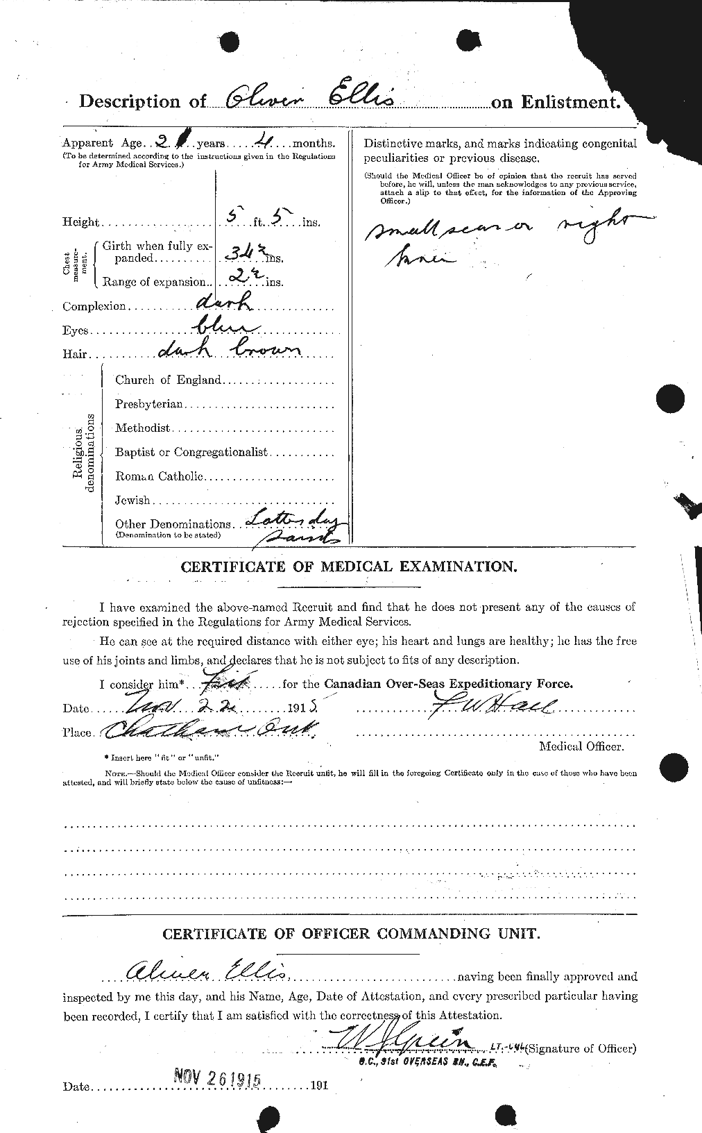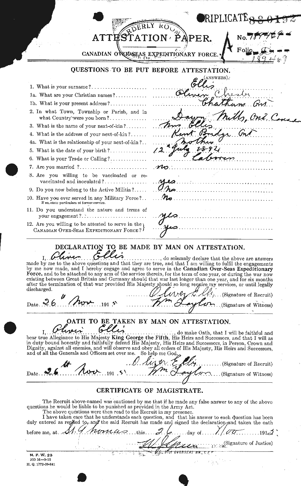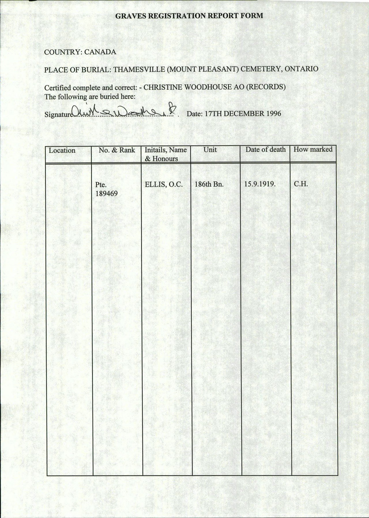 Family Search: When Private Oliver Chester Ellis was born on 12 July 1898, in Bothwell, Chatham-Kent, Ontario, Canada, his father, Chester Ellis, was 41 and his mother, Margaret Duncan, was 37. He registered for military service in 1915. In 1915, at the age of 17, his occupation is listed as labourer in Chatham, Kent, Ontario, Canada. He died on 15 September 1919, in Sainte-Anne-de-Bellevue, Jacques-Cartier, Quebec, Canada, at the age of 21, and was buried in Mount Pleasant Cemetery, Thamesville, Chatham-Kent, Ontario, Canada.