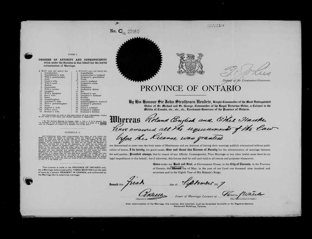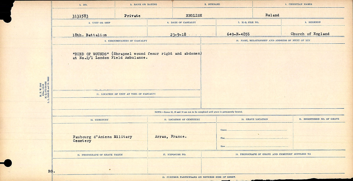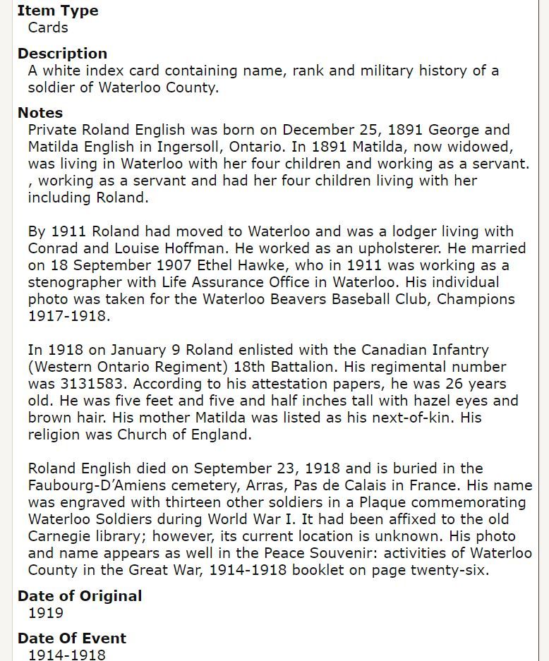 Family Search: Private Roland English was born on 25 December 1892, in Ingersoll, Oxford, Ontario, Canada as the son of Wlliam English and Matilda Merner. He married Ethel Pearl Hawke on 1 September 1917, in Waterloo, Ontario, Canada. He lived in Waterloo, Ontario, Canada in 1918. He registered for military service in 1918. In 1918, his occupation is listed as poster in Waterloo, Ontario, Canada. He died on 23 September 1918, in France, at the age of 25, and was buried in Arras, Pas-de-Calais, Nord-Pas-de-Calais, France.