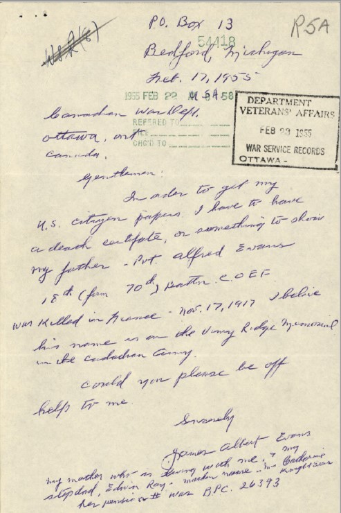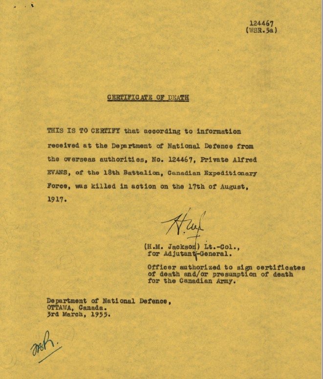 Family Search: Private Alfred Evans was born on 7 November 1877, in Dundee, Forfarshire, Scotland, United Kingdom. He had at least 1 son and 1 daughter with Catherine Knight. He immigrated to United States in 1913 and lived in Detroit, Wayne, Michigan, United States in 1915. He registered for military service in 1915. In 1915, at the age of 38, his occupation is listed as machinist in Detroit, Wayne, Michigan, United States. He died on 17 August 1917, in Lens, Pas-de-Calais, Nord-Pas-de-Calais, France, at the age of 39, and was buried in Vimy, Pas-de-Calais, Hauts-de-France, France.