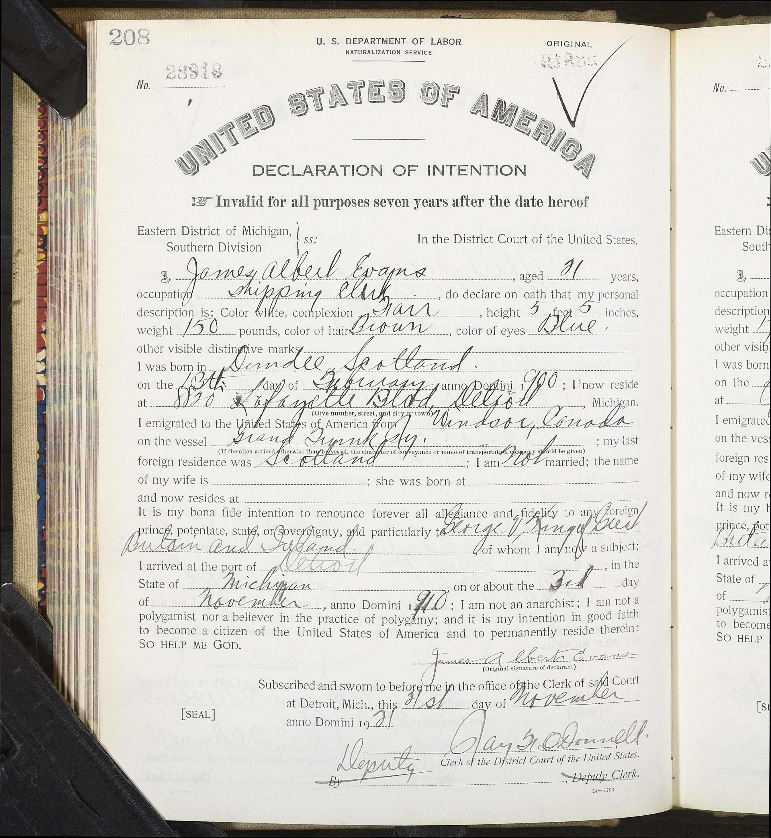 Family Search: Private Alfred Evans was born on 7 November 1877, in Dundee, Forfarshire, Scotland, United Kingdom. He had at least 1 son and 1 daughter with Catherine Knight. He immigrated to United States in 1913 and lived in Detroit, Wayne, Michigan, United States in 1915. He registered for military service in 1915. In 1915, at the age of 38, his occupation is listed as machinist in Detroit, Wayne, Michigan, United States. He died on 17 August 1917, in Lens, Pas-de-Calais, Nord-Pas-de-Calais, France, at the age of 39, and was buried in Vimy, Pas-de-Calais, Hauts-de-France, France.