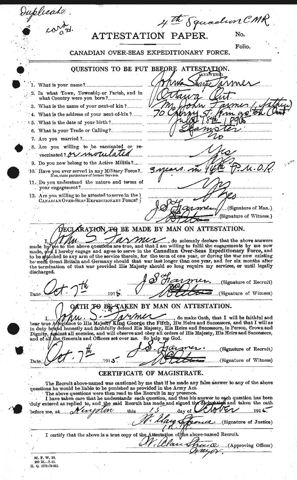 Family Search: When Sergeant John Sharpe Farmer was born on 18 July 1895, in Gloucester, Carleton, Ontario, Canada, his father, John George Farmer, was 31 and his mother, Elizabeth Sharpe, was 30. He lived in Carleton, Ontario, Canada in 1901 and Russell, Prescott and Russell, Ontario, Canada in 1911. He registered for military service in 1918. In 1918, his occupation is listed as sergeant in canadian infantry 18th bn. (western ontario regiment) in Rivière, Pas-de-Calais, France. He died on 14 April 1918, in Neuville-Vitasse, Pas-de-Calais, France, at the age of 22, and was buried in Arras, Loir-et-Cher, France.