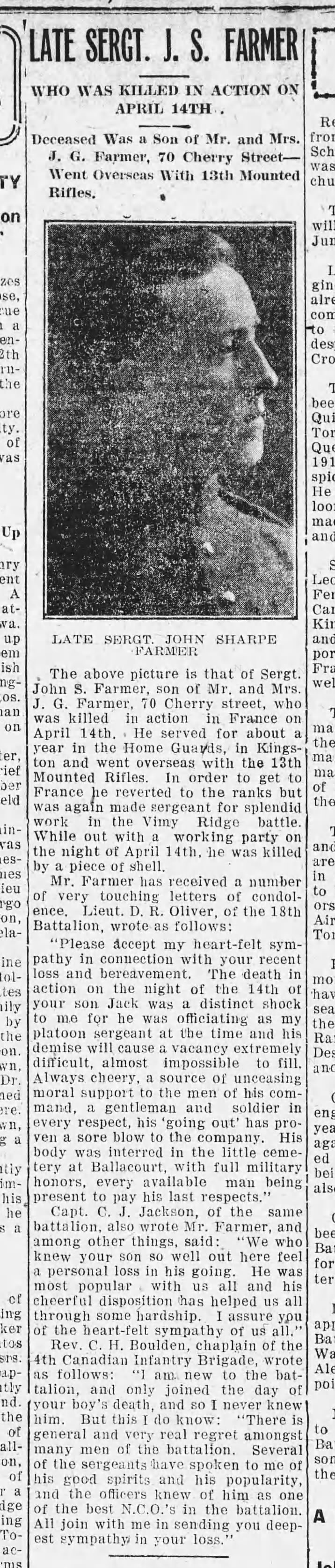 The above picture is that of Sergt. John S. Farmer, son of Mr. and Mrs. J. G. Farmer, 70 Cherry street, who was killed in action in France on April 14th. He served for about a year in the Home Guards in Kingston and went overseas with the 13th Mounted Rifles. In order to get to France he reverted to the ranks but was again made sergeant for splendid work in the Vimy Ridge battle.