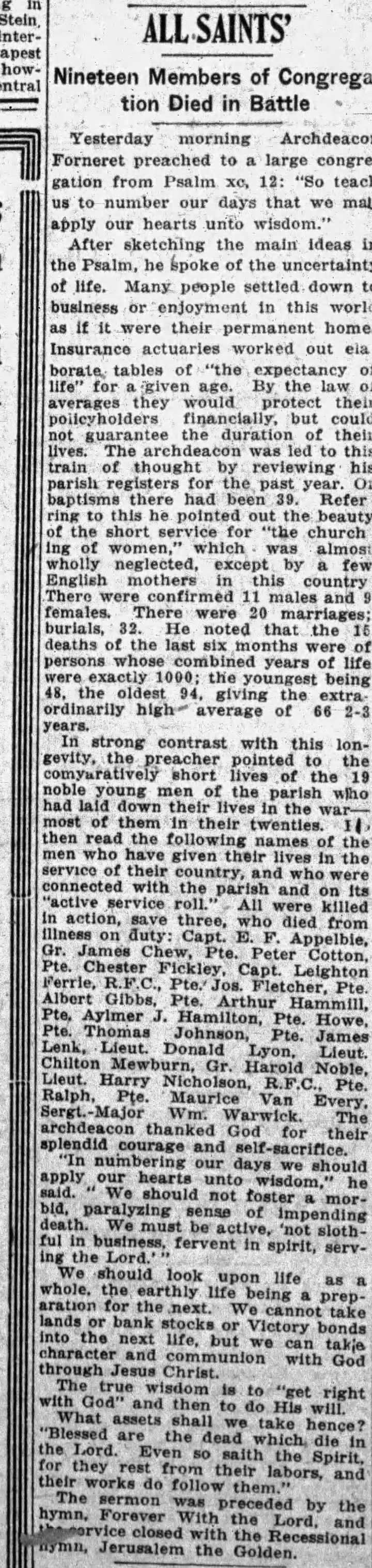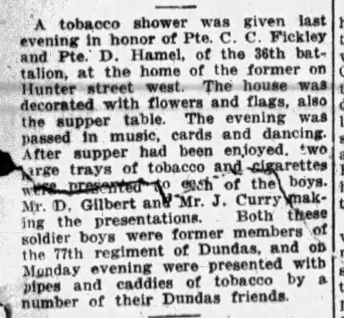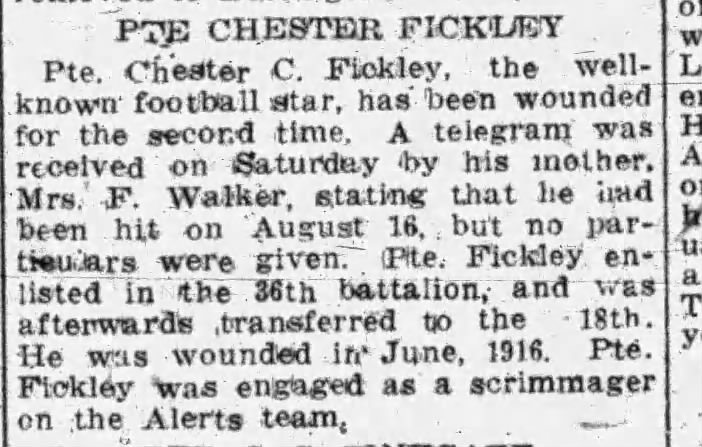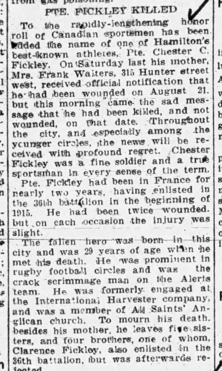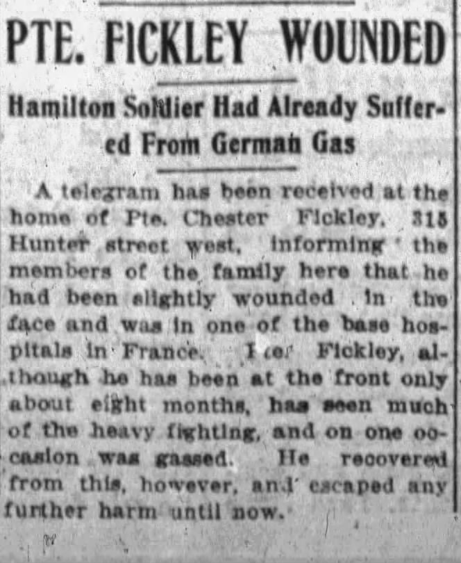 Family Search: When Private Chester Charles Fickley was born on 23 June 1886, in Hamilton, Wentworth, Ontario, Canada, his father, William Edward Fickley, was 27 and his mother, Agnes Gertrude Mulcahy, was 20. He immigrated to Vermont, United States in 1895 and lived in Hamilton, Ontario, Canada in 1911. He registered for military service in 1915. In 1915, at the age of 29, his occupation is listed as labourer in Hamilton, Wentworth, Ontario, Canada. He died on 21 August 1917, in Lens, Pas-de-Calais, France, at the age of 31, and was buried in Aix-Noulette, Pas-de-Calais, France