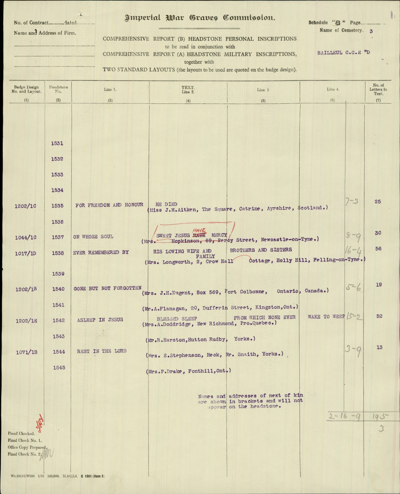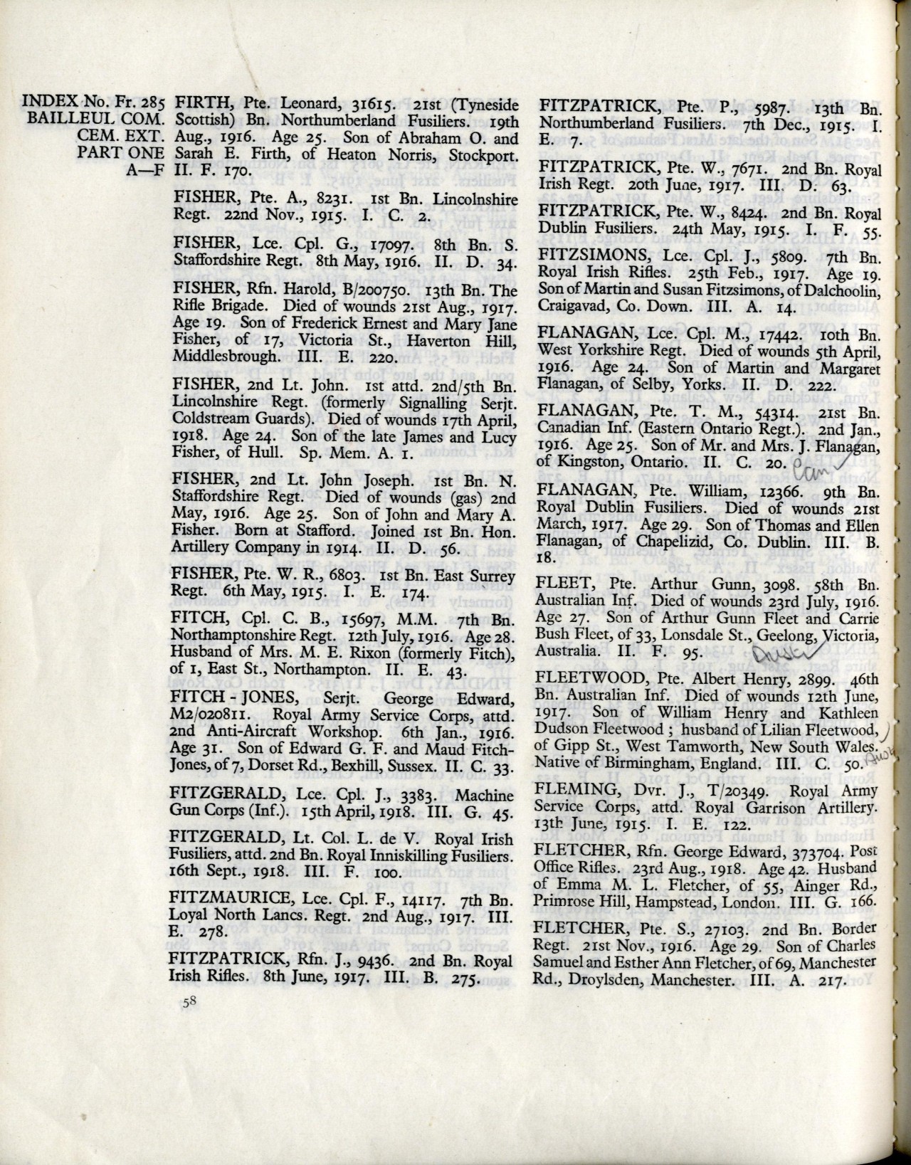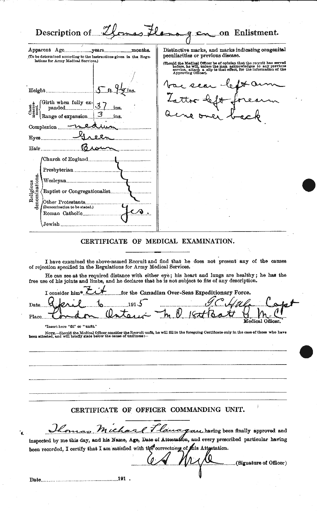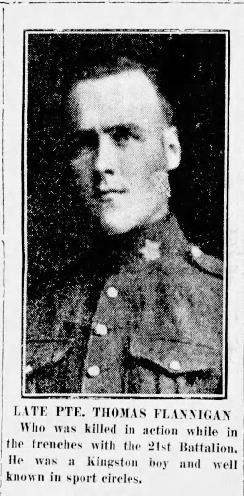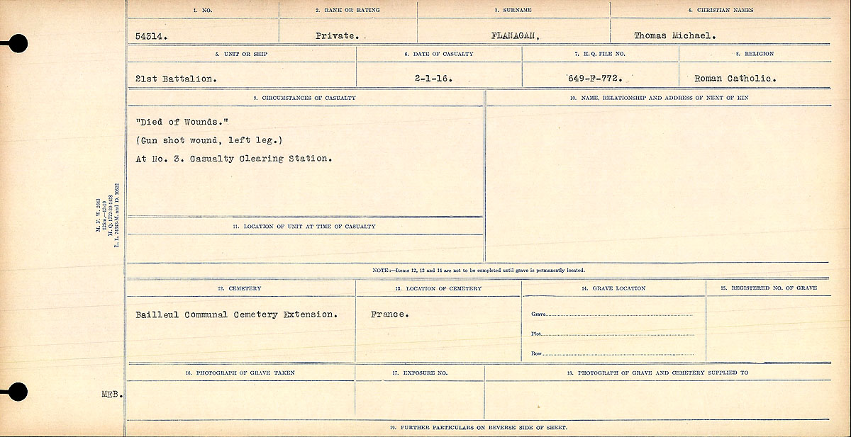 Family Search: When Private Thomas Michael Flanagan was born on 29 June 1890, in Kingston Township, Frontenac, Ontario, Canada, his father, John Thomas Flanagan, was 25 and his mother, Mary Ann Johnson, was 24. He lived in Ontario, Canada in 1890 and Kingston, Frontenac, Ontario, Canada in 1901. He registered for military service in 1915. In 1916, his occupation is listed as sailor. He died on 2 January 1916, in Bailleul-Sud-Ouest, Arrondissement of Dunkirk, Nord, Nord-Pas-de-Calais, France, at the age of 25, and was buried in Bailleul, Nord, Nord-Pas-de-Calais, France.