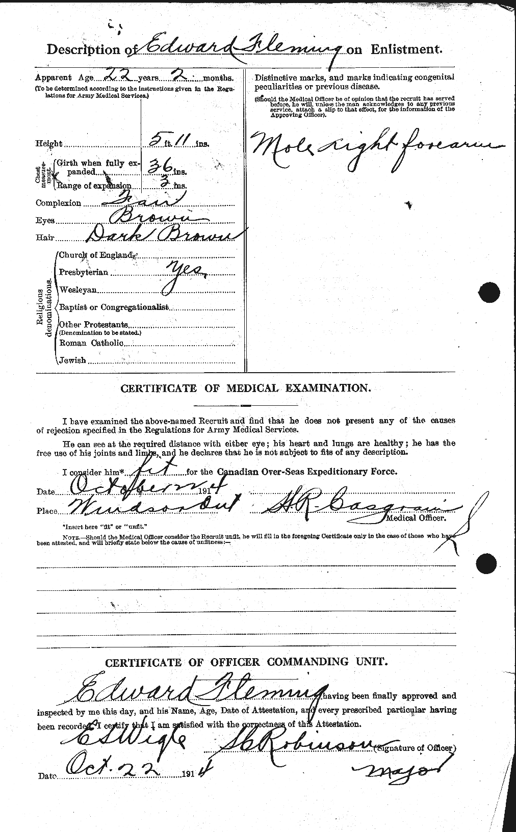 Family Search: When Lance Corporal Edward George Fleming was born on 13 August 1892, in Owen Sound, Grey, Ontario, Canada, his father, George H Fleming, was 22 and his mother, Elizabeth McGeary, was 24. He lived in Grey, Ontario, Canada for about 10 years. He registered for military service in 1914. In 1914, at the age of 22, his occupation is listed as clerk. He died on 19 April 1916, in Camiers, Pas-de-Calais, Nord-Pas-de-Calais, France, at the age of 23, and was buried in Etaples Military Cemetery, Étaples, Pas-de-Calais, Nord-Pas-de-Calais, France.