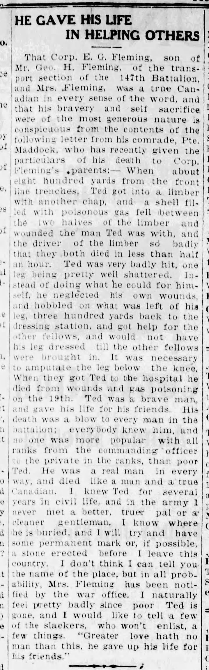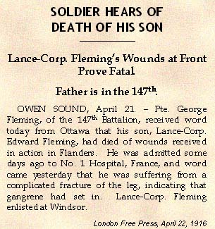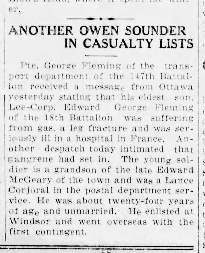 OWEN SOUND, April 21 – Pte. George Fleming, of the 147th Battalion, received word today from Ottawa that his son, Lance-Corp. Edward Fleming, had died of wounds received in action in Flanders. He was admitted some days ago to No. 1 Hospital, France, and word came yesterday that he suffered from a complicated fracture of the leg, indicating that gangrene had set in. Lance-Corporal Fleming enlisted at Windsor.