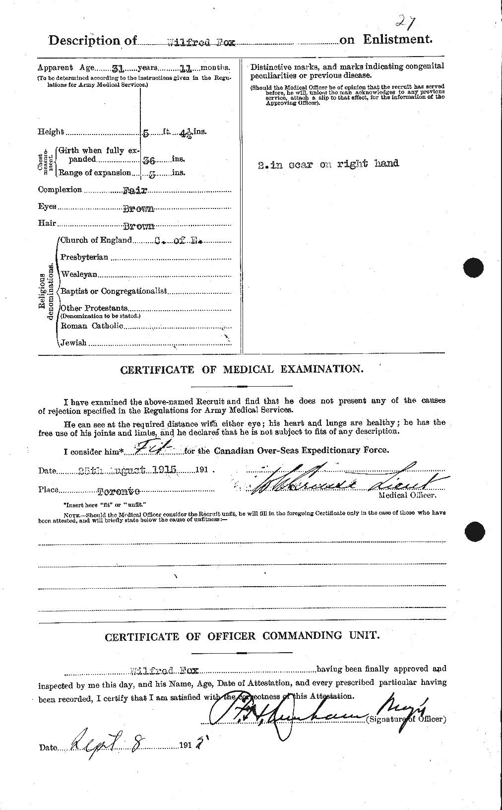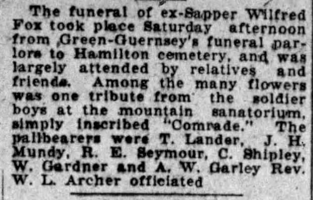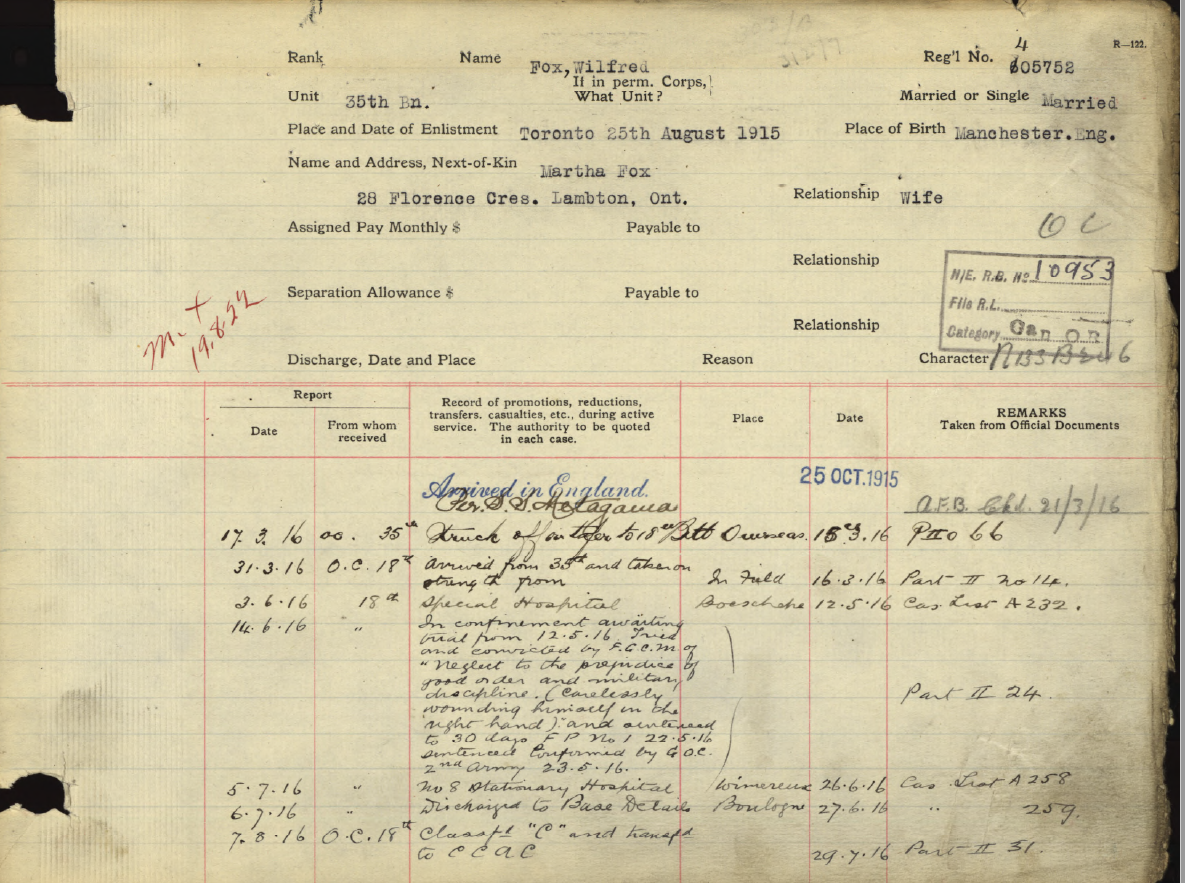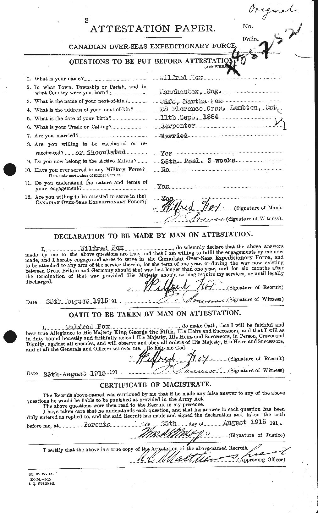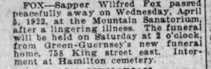 Family Search: When Private Wilfred Fox was born on 11 September 1884, in Prestwich, Greater Manchester, England, United Kingdom, his father, Issac Arthur Fox, was 30 and his mother, Elizabeth Jane Barnsley, was 31. He married Bartha Lambert on 29 July 1909, in York, Ontario, Canada. They were the parents of at least 1 son. He lived in Hamilton, Ontario, Canada in 1901. He registered for military service in 1915. In 1915, at the age of 31, his occupation is listed as carpenter. He died on 5 April 1922, in Hamilton, Wentworth, Ontario, Canada, at the age of 37, and was buried in Hamilton Cemetery, Hamilton, Ontario, Canada.