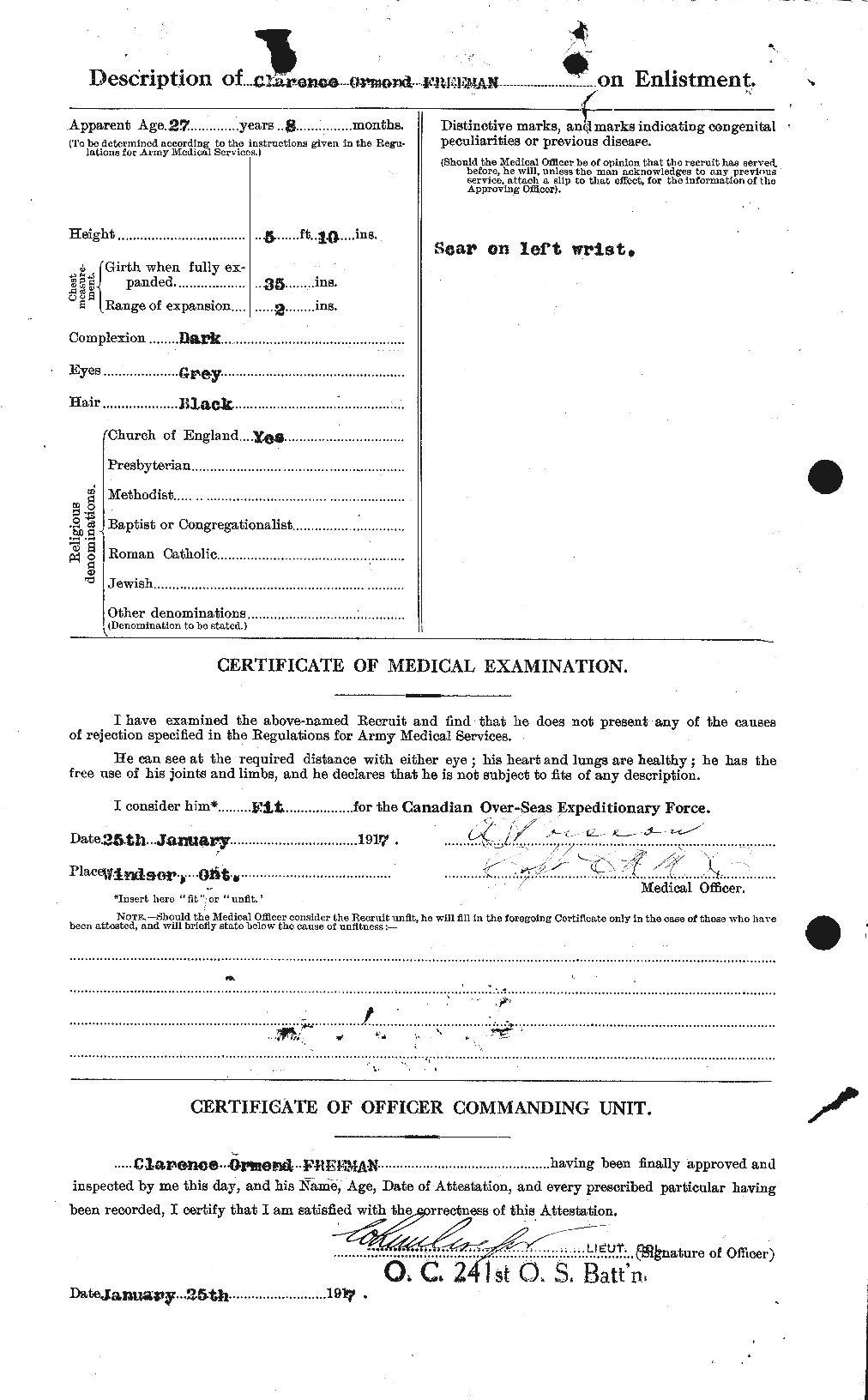 This 27-year-old motor car repairman decided to enlist with the 241st Overseas Battalion on January 25, 1917, at Windsor, Ontario. He had been working and residing in Detroit but something compelled him to join the army.