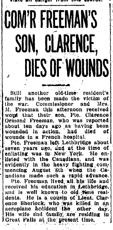 Family Search: When Private Clarence Ormond Freeman was born on 5 May 1889, in Grenfell Beach, Shesheep 74A, Saskatchewan, Canada, his father, Manfred Freeman, was 24 and his mother, Esther Sherlock, was 27. He married Dorothy Emily Farley in May 1912, in Lethbridge, Alberta, Canada. He immigrated to Vermont, United States in 1916 and lived in Detroit, Wayne, Michigan, United States in 1917 and New York City, New York, United States in 1920. He registered for military service in 1917. In 1917, at the age of 28, his occupation is listed as motor car repairman in Detroit, Wayne, Michigan, United States. He died on 21 August 1918, in Abbeville, Somme, Picardie, France, at the age of 29, and was buried in Abbeville, Somme, Picardie, France.