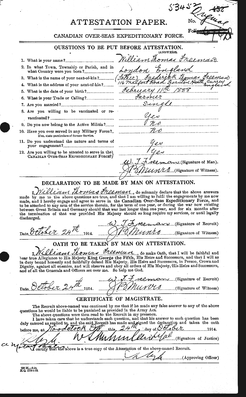 Son of Frederick Thomas and Susan Sophia Freeman, of Thornton Heath, Surrey, England.