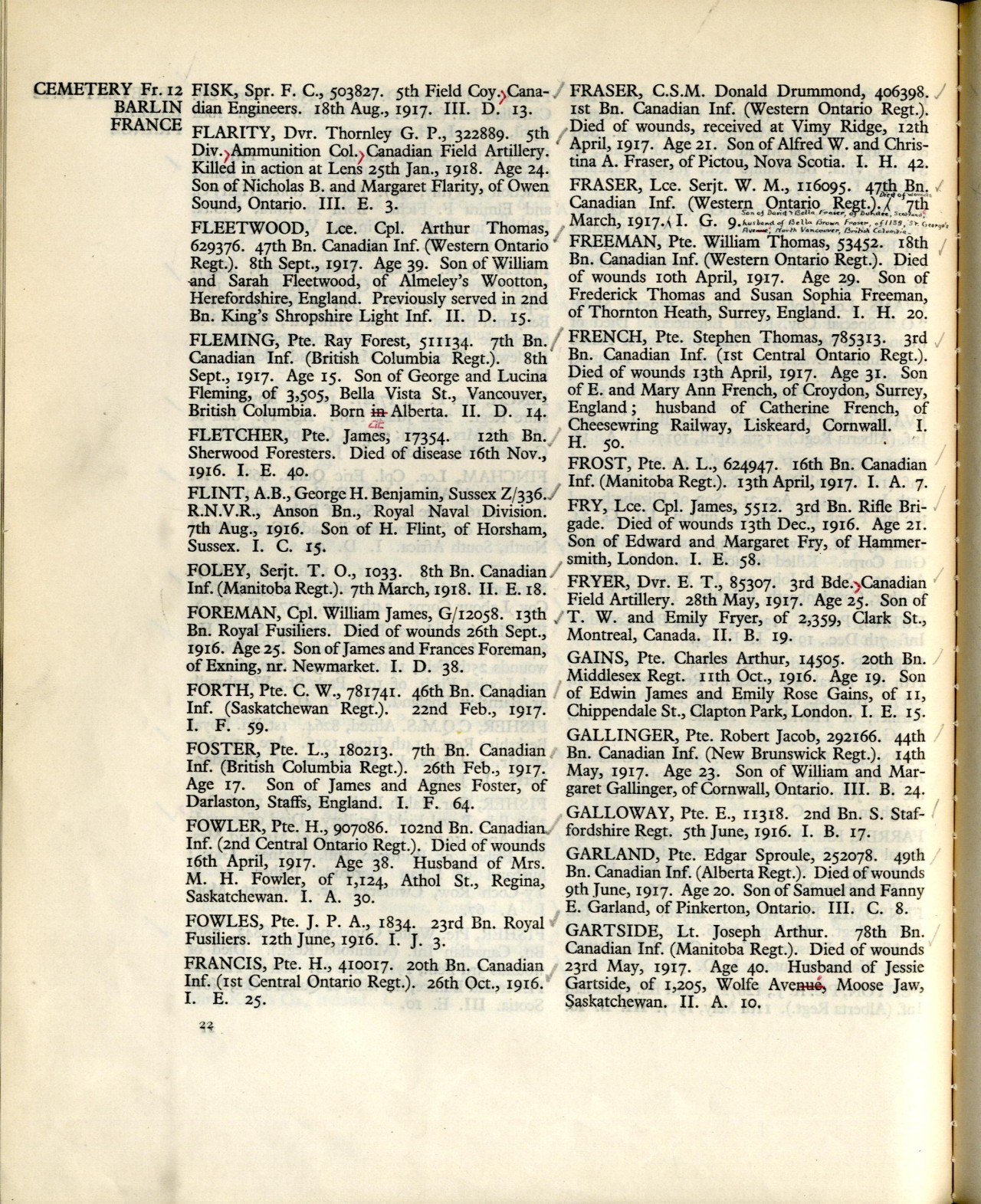 Family Search: When Private William Thomas Freeman was born on 11 February 1888, in City of London, England, United Kingdom, his father, Frederick Thomas Freeman, was 29 and his mother, Susan Sophia Morris, was 31. He immigrated to Canada in 1914. He registered for military service in 1914. In 1914, at the age of 26, his occupation is listed as farmer. He died on 10 April 1917, in Barlin, Pas-de-Calais, Nord-Pas-de-Calais, France, at the age of 29.