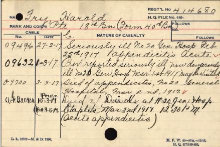 Fry, Harold: Service no. 414680 CVWM Page CWGC Page Digitized Service Record Source: Document in Private Beaver’s service record. Find-A-Grave Photo of Harold Fry – my grandmother Fanny and her husband Harold Fry. Source: CVWM Died of Acute Appendicitis at 12:30 PM. No. 20 Gen. Hos. Etaples, France. Share this: Click to email a link to a friend (Opens in new window) Email Click to share on Facebook (Opens in new window) Facebook Click to share on X (Opens in new window) X Click to share on Reddit (Opens in new window) Reddit Click to share on LinkedIn (Opens in new window) LinkedIn Click to print (Opens in new window) Print Click to share on Tumblr (Opens in new window) Tumblr Click to share on Pocket (Opens in new window) Pocket Click to share on Pinterest (Opens in new window) Pinterest Click to share on Telegram (Opens in new window) Telegram Click to share on WhatsApp (Opens in new window) WhatsApp Like Loading...