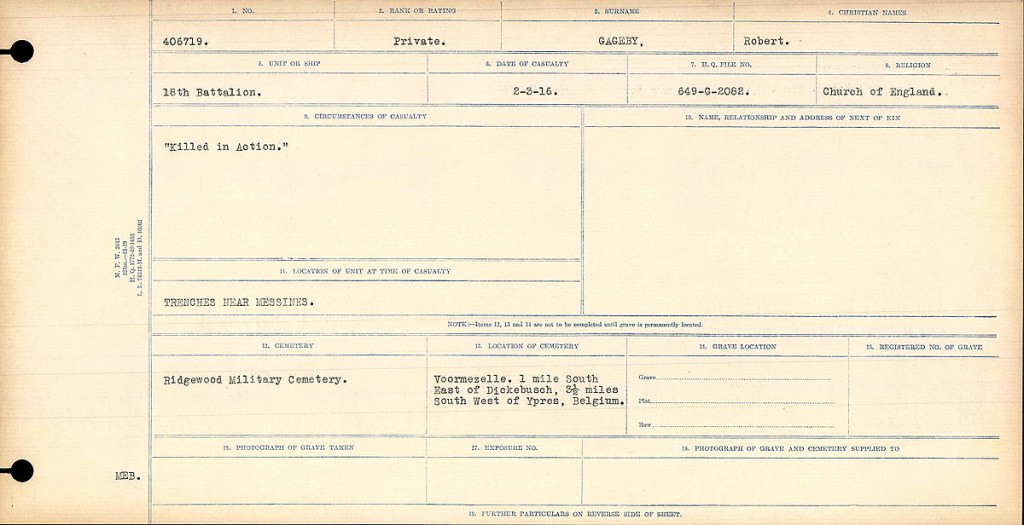Gageby, Robert: Service no. 406719 CVWM Page Digitized Service Record CWGC Page Source: Roll of Honour enumerated in “Duty Nobly Done”. Find-A-Grave Share this: Click to email a link to a friend (Opens in new window) Email Click to share on Facebook (Opens in new window) Facebook Click to share on X (Opens in new window) X Click to share on Reddit (Opens in new window) Reddit Click to share on LinkedIn (Opens in new window) LinkedIn Click to print (Opens in new window) Print Click to share on Tumblr (Opens in new window) Tumblr Click to share on Pocket (Opens in new window) Pocket Click to share on Pinterest (Opens in new window) Pinterest Click to share on Telegram (Opens in new window) Telegram Click to share on WhatsApp (Opens in new window) WhatsApp Like Loading...