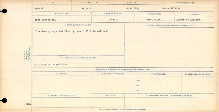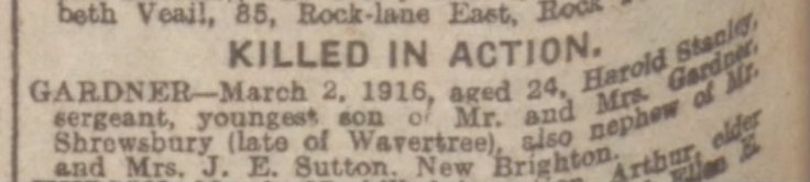 Family Search: When Sergeant Harold Stanley Gardner was born in 1891, in Westbury, Shropshire, England, United Kingdom, his father, John Gardner, was 39 and his mother, Jane, was 39. He immigrated to Canada in 1913 and lived in Wavertree, Lancashire, England, United Kingdom in 1901 and Oswestry, Shropshire, England, United Kingdom in 1911. He registered for military service in 1914. In 1914, at the age of 23, his occupation is listed as furniture finisher. He died on 2 March 1916, in Ieper, West Flanders, Belgium, at the age of 25, and was buried in Ieper, West Flanders, Belgium.