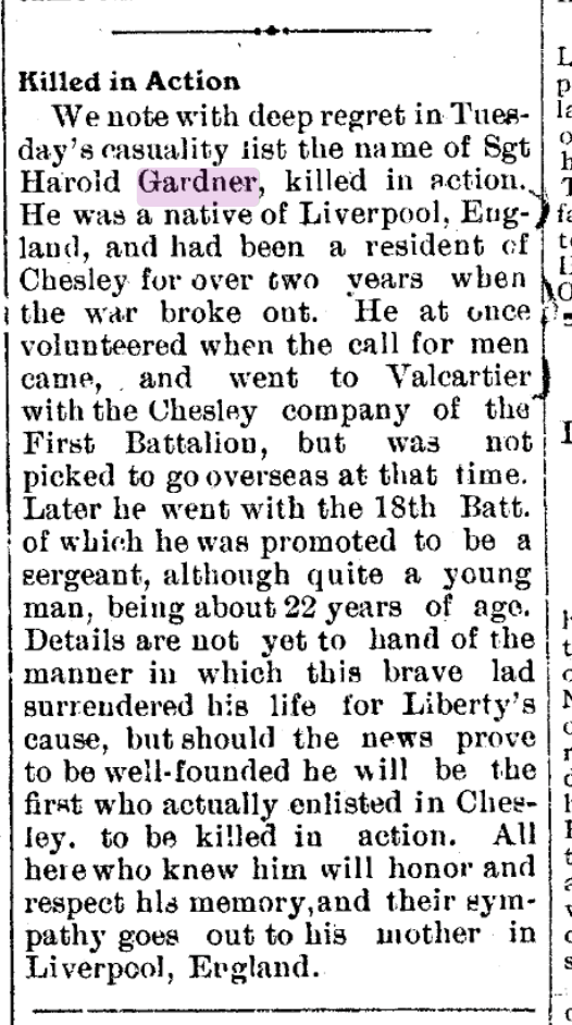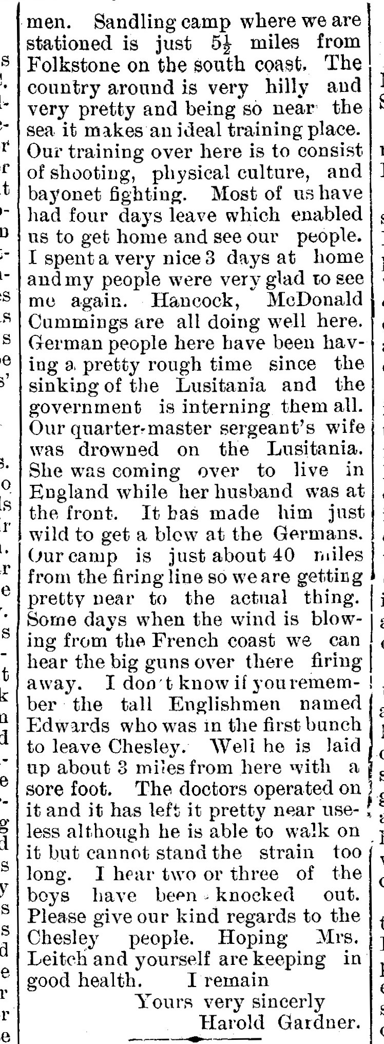 HAROLD GARDNER one of the Chesley contingent writing to Mr. Leitch from Sandling Camp, Hythe, Kent on May 16th 1915 says: “Dear Mr. Leitch.—