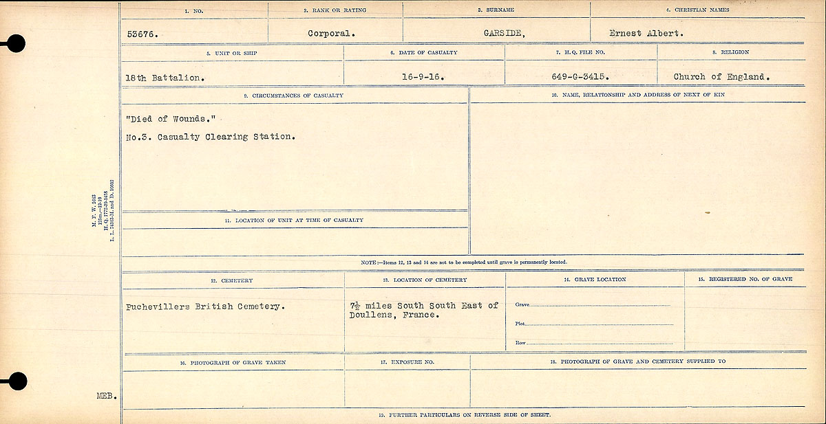 Family Search: When Corporal Ernest Albert Garside was born on 16 January 1886, in London, Ontario, Canada, his father, Thomas B Garside, was 24 and his mother, Alice Mary Frost, was 20. He lived in Elgin, Ontario, Canada for about 10 years. He registered for military service in 1914. In 1914, at the age of 28, his occupation is listed as boilermaker. He died on 16 September 1916, in Puchevillers, Somme, Picardie, France, at the age of 30, and was buried in Puchevillers British Cemetery, Puchevillers, Somme, Picardie, France.