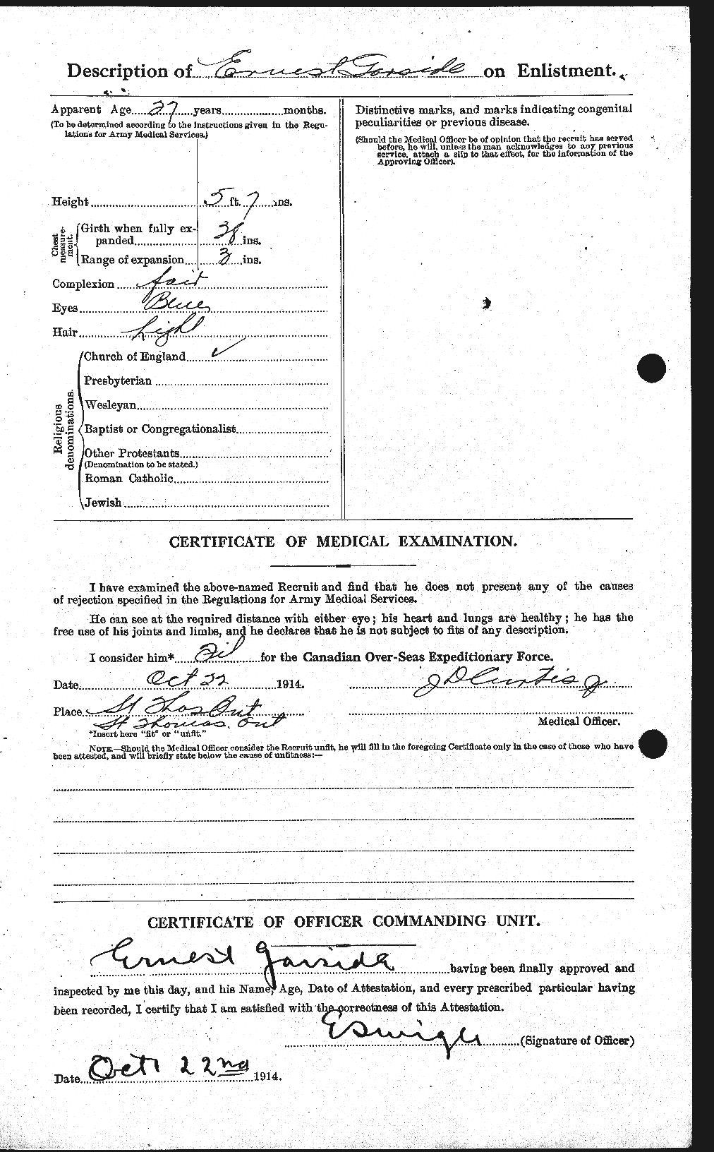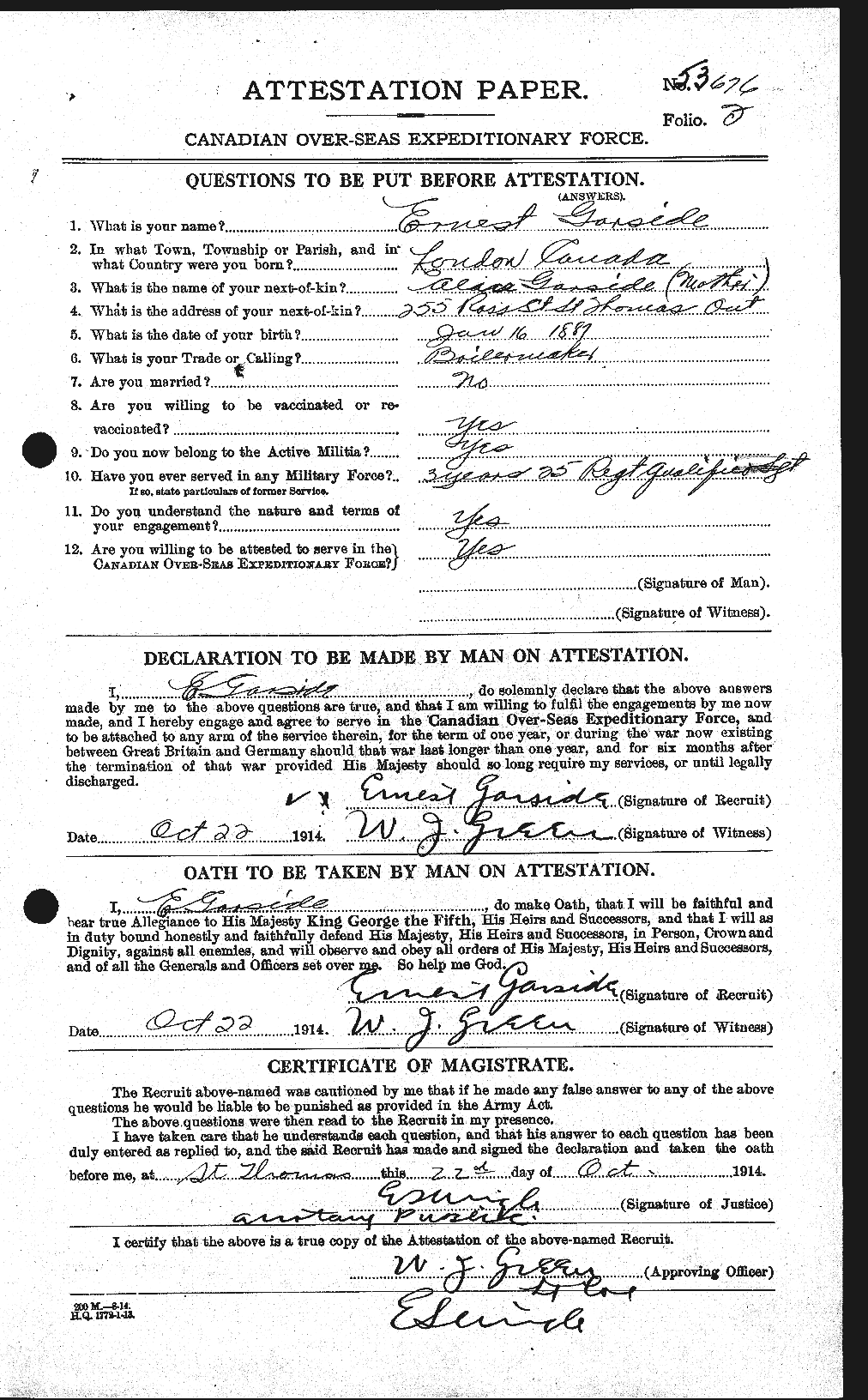 This single 27-year-old boilermaker with 3-years militia experience with the 25th Regiment enlisted with the 18th Battalion on October 22, 1915, at St. Thomas, Ontario.