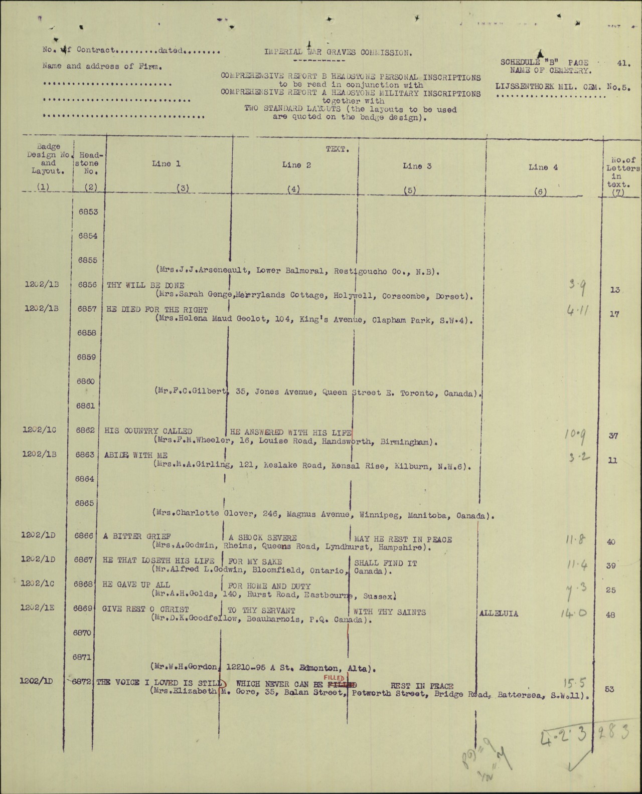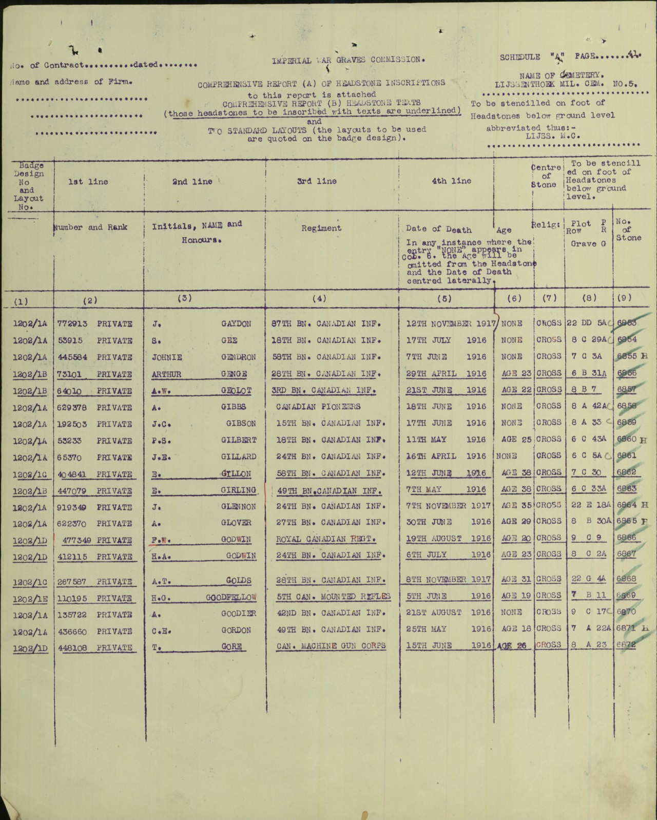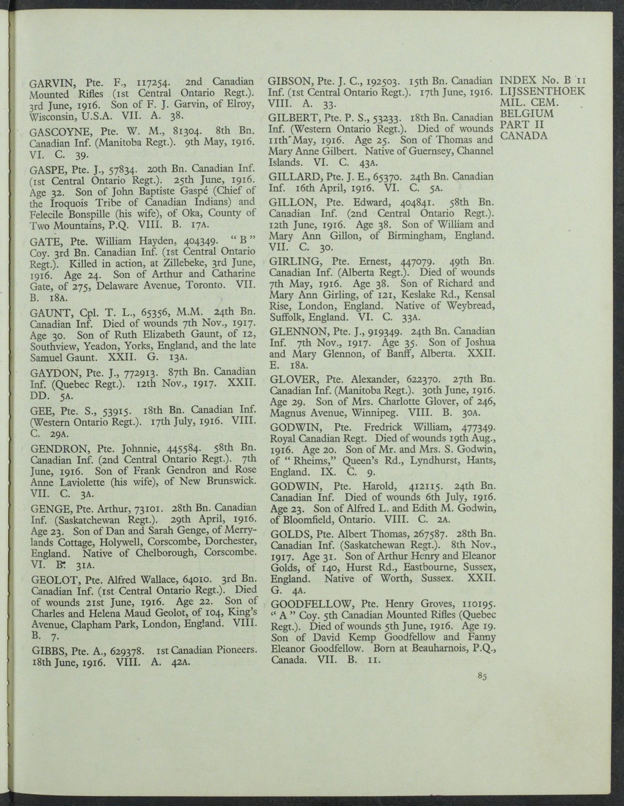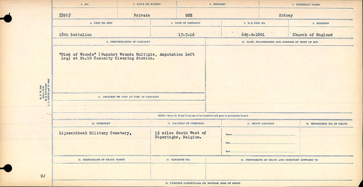 Family Search: When Private Walter Sidney Gee was born on 21 September 1896, in Leicester, Leicestershire, England, United Kingdom, his father, Alfred Gee, was 31 and his mother, Elizabeth Ball, was 32. He immigrated to Galt, Waterloo, Ontario, Canada in 1913. He registered for military service in 1914. In 1914, at the age of 18, his occupation is listed as labourer in Galt, Waterloo, Ontario, Canada. He died on 17 July 1916, in Poperinge, West Flanders, Belgium, at the age of 19, and was buried in Ieper, West Flanders, Belgium.