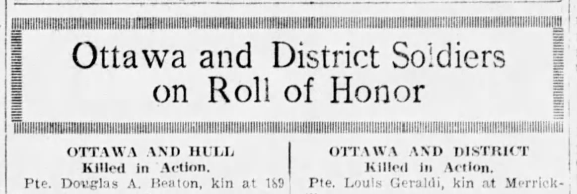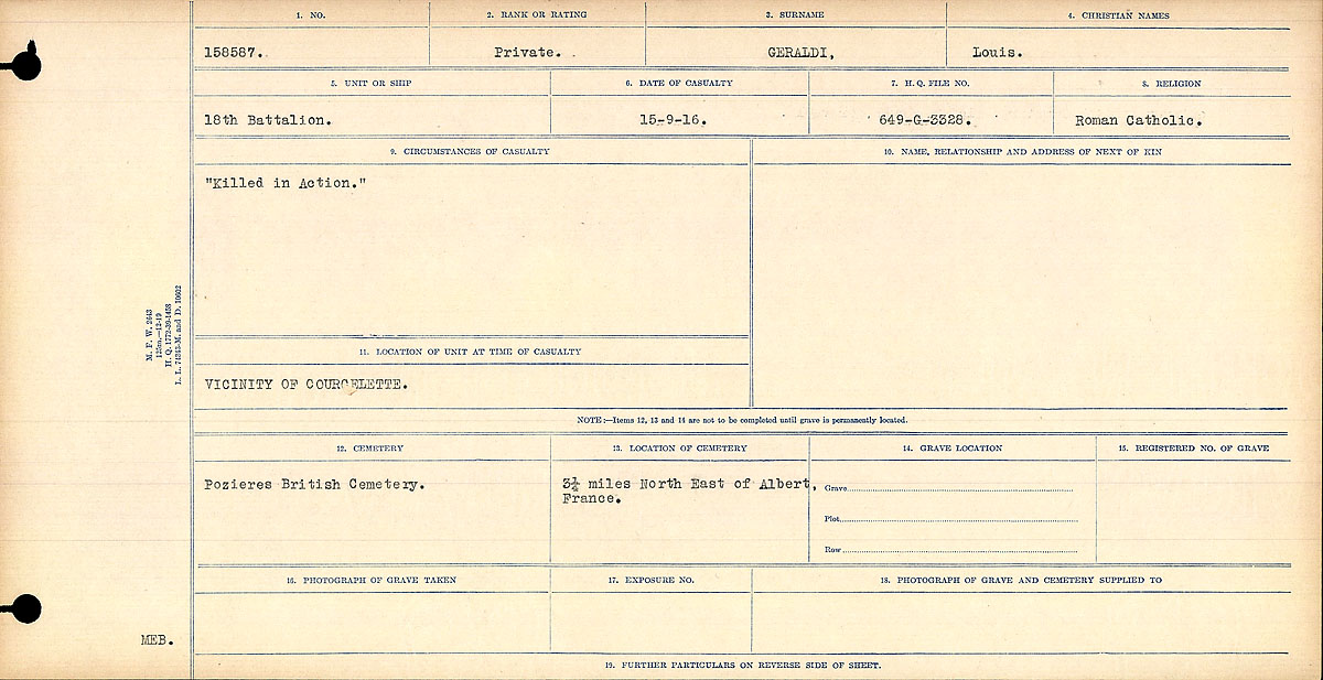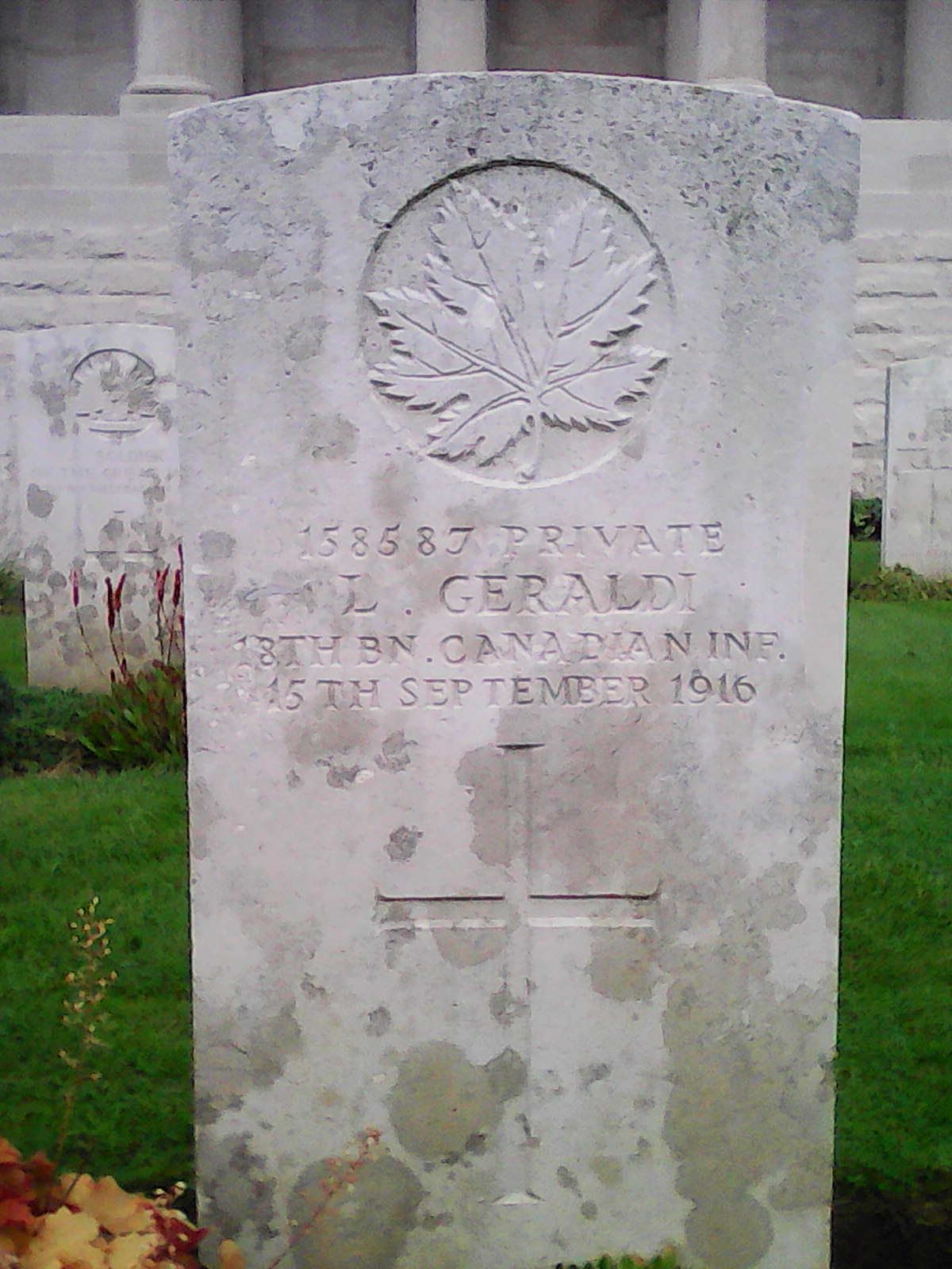 Family Search: When Private Louis Joseph Geraldi was born on 7 January 1884, in Gananoque, Leeds and Grenville, Ontario, Canada, his father, Oliver Geraldie, was 23 and his mother, Margaret Gallipeau, was 26. He married Elizabeth Jane White on 20 June 1908, in Merrickville, Merrickville-Wolford, Leeds and Grenville, Ontario, Canada. He immigrated to Vermont, United States in 1911 and lived in Lanark, Ontario, Canada in 1901. He registered for military service in 1915. In 1915, at the age of 31, his occupation is listed as wool manufacturer in Merritton, Lincoln, Ontario, Canada. He died on 15 September 1916, in Courcelette, Somme, Picardie, France, at the age of 32, and was buried in Pozieres British Cemetery, Pozières, Somme, Picardie, France.