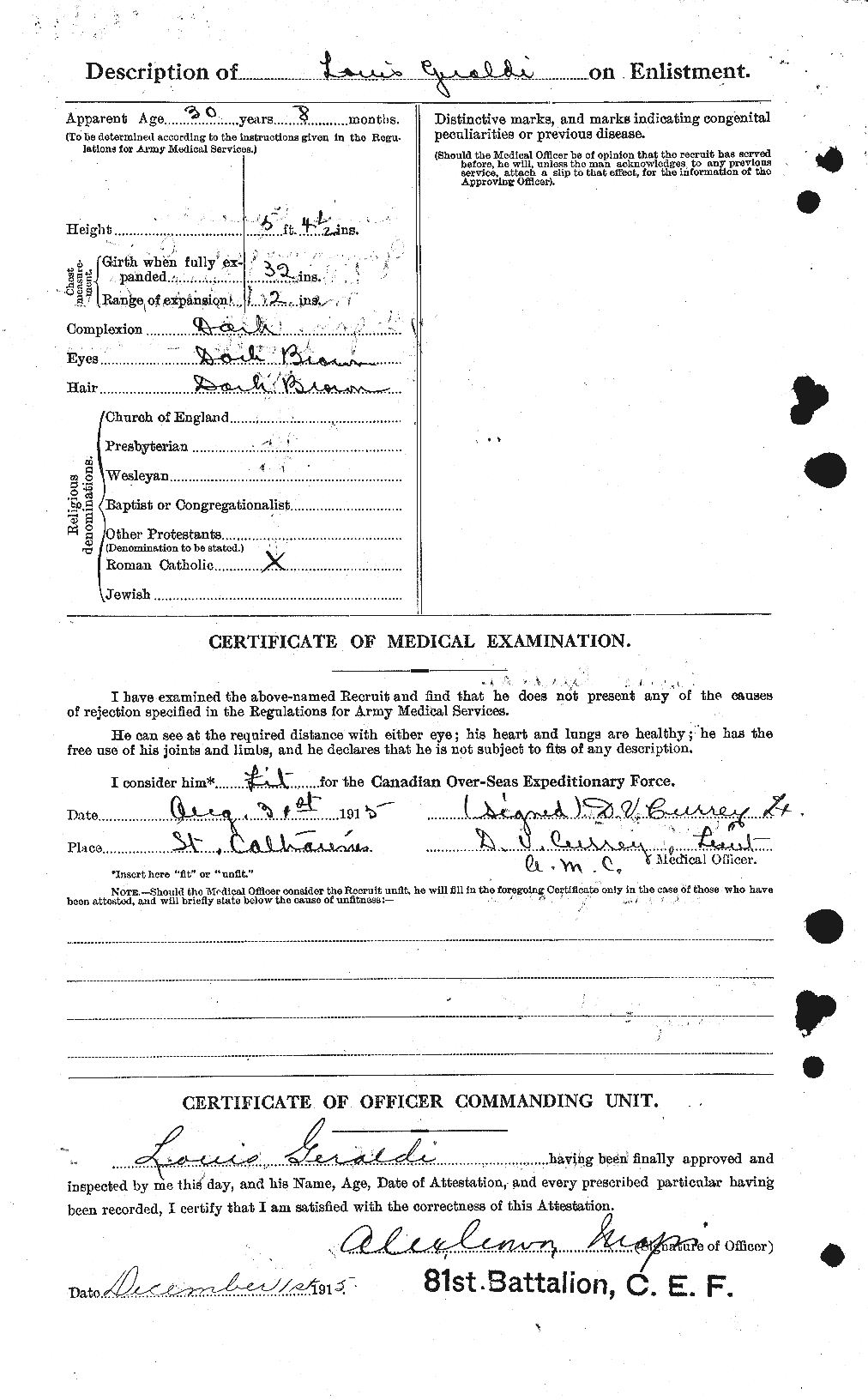 This man was married (Lillian White) wool manufacturer enlisted with the 81st Battalion at the age of 30. He enlisted on August 31, 1915, at St. Catherines, Ontario.