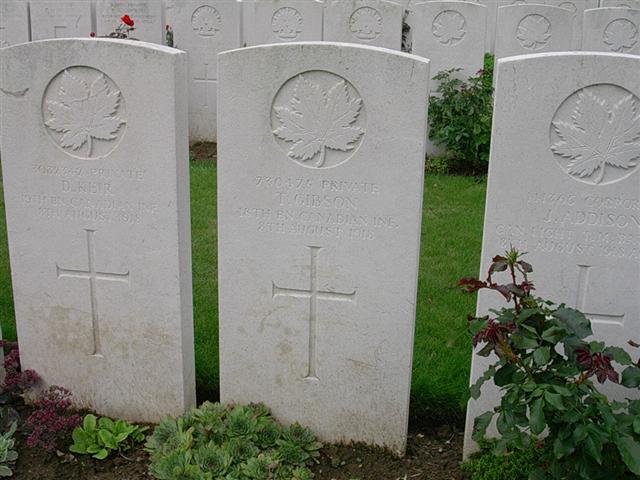 Family Search: Private Thomas Gibson was born on 29 May 1897, in Colchester, Essex, England, United Kingdom. He immigrated to Canada in 1913 and lived in Galt, Waterloo, Ontario, Canada in 1916. He registered for military service in 1916. In 1916, at the age of 19, his occupation is listed as labourer in Galt, Waterloo, Ontario, Canada. He died on 8 August 1918, in Marcelcave, Somme, Hauts-de-France, France, at the age of 21, and was buried in Villers-Bretonneux, Somme, Picardie, France.