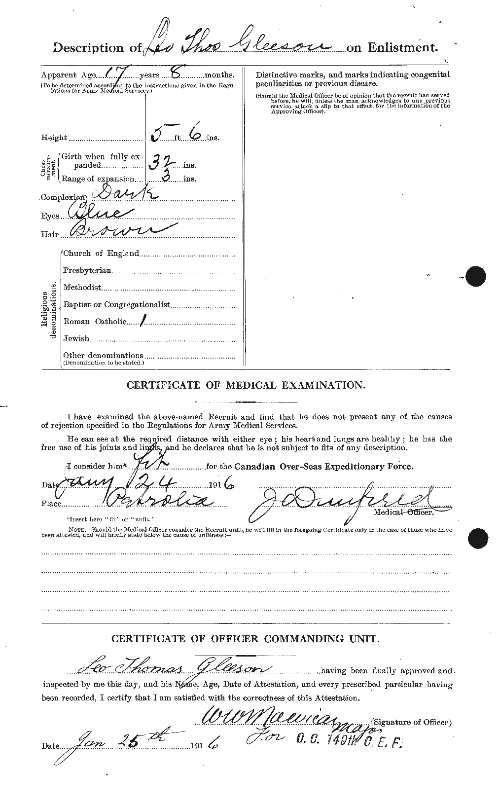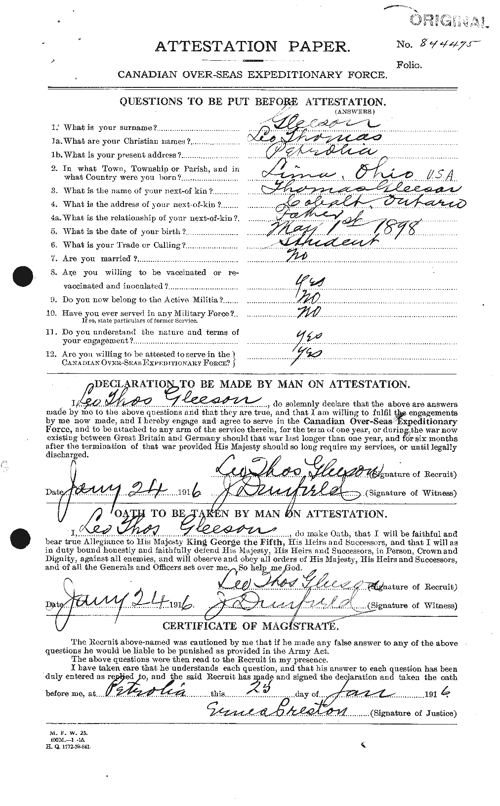 Joining the 149th Battalion at Petrolia, Ontario on January 24, 1916, this 19-year-old student was off to war. He was born in the United States and may have joined as an Americal citizen as he may not have been a British subject.