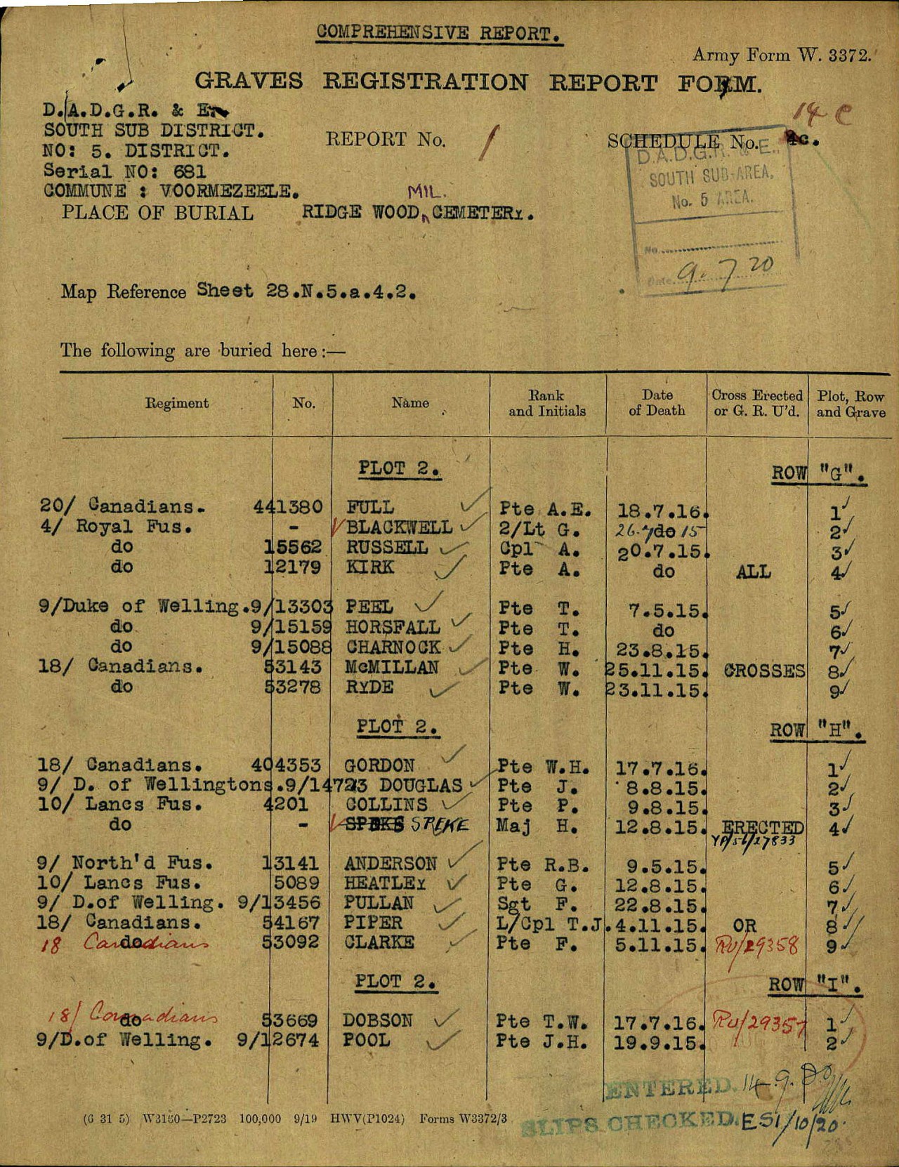Family Search: Private William Hunter Gordon was born on 17 November 1892, in Aberdeenshire, Scotland, United Kingdom as the son of James Gordon and Jessie. He immigrated to Toronto, Ontario, Canada in 1912. He registered for military service in 1915. In 1913, his occupation is listed as bookkeeper, evening telegram in Toronto, Ontario, Canada. He died on 17 July 1916, in Ieper, West Flanders, Belgium, at the age of 23, and was buried in Voormezele, Ieper, West Flanders, Belgium.