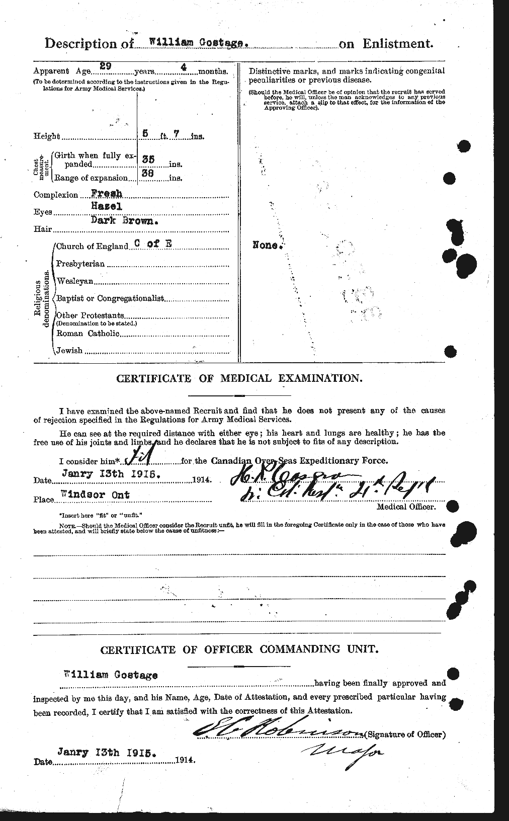 Family Search: Private William Gostage was born on 16 October 1885, in Liverpool, Merseyside, England, United Kingdom. He immigrated to North America in 1914. He registered for military service in 1915. In 1915, at the age of 30, his occupation is listed as machinist. He died on 6 June 1916, in Ieper, West Flanders, Belgium, at the age of 30.