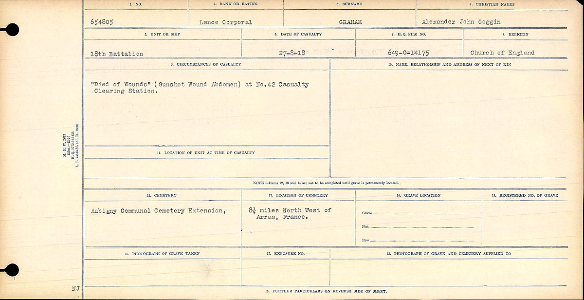 Family Search: When Lance-Corporal Alexander John Goggin Graham was born on 2 August 1892, in Fordwich, Huron, Ontario, Canada, his father, Adam Alexander Graham, was 27 and his mother, Louisa Goggin, was 24. He lived in Huron, Ontario, Canada in 1911. He registered for military service in 1916. In 1915, at the age of 23, his occupation is listed as farmer. He died on 27 August 1918, in Arras, Pas-de-Calais, Hauts-de-France, France, at the age of 26, and was buried in Aubigny Communal Cemetery Extension, Aubigny, Pas-de-Calais, Nord-Pas-de-Calais, France.