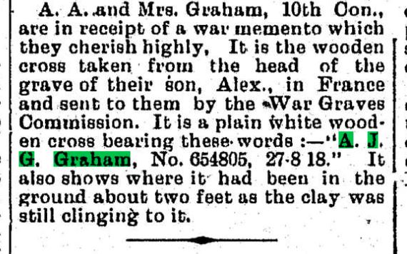 A.A. and Mrs. Graham, 10th Con.m are in receipt of a war memento which they cherish highly. It is the wood cross taken from the head of the grave of their son, Alex, in France and sent to them by the War Graves Commission. It is a plain white wooden cross bearing these words:- “A.J.G. Graham, No. 654805, 27-8-18.” It also shows where it had been in the ground about two feet as the clay was still clinging to it.