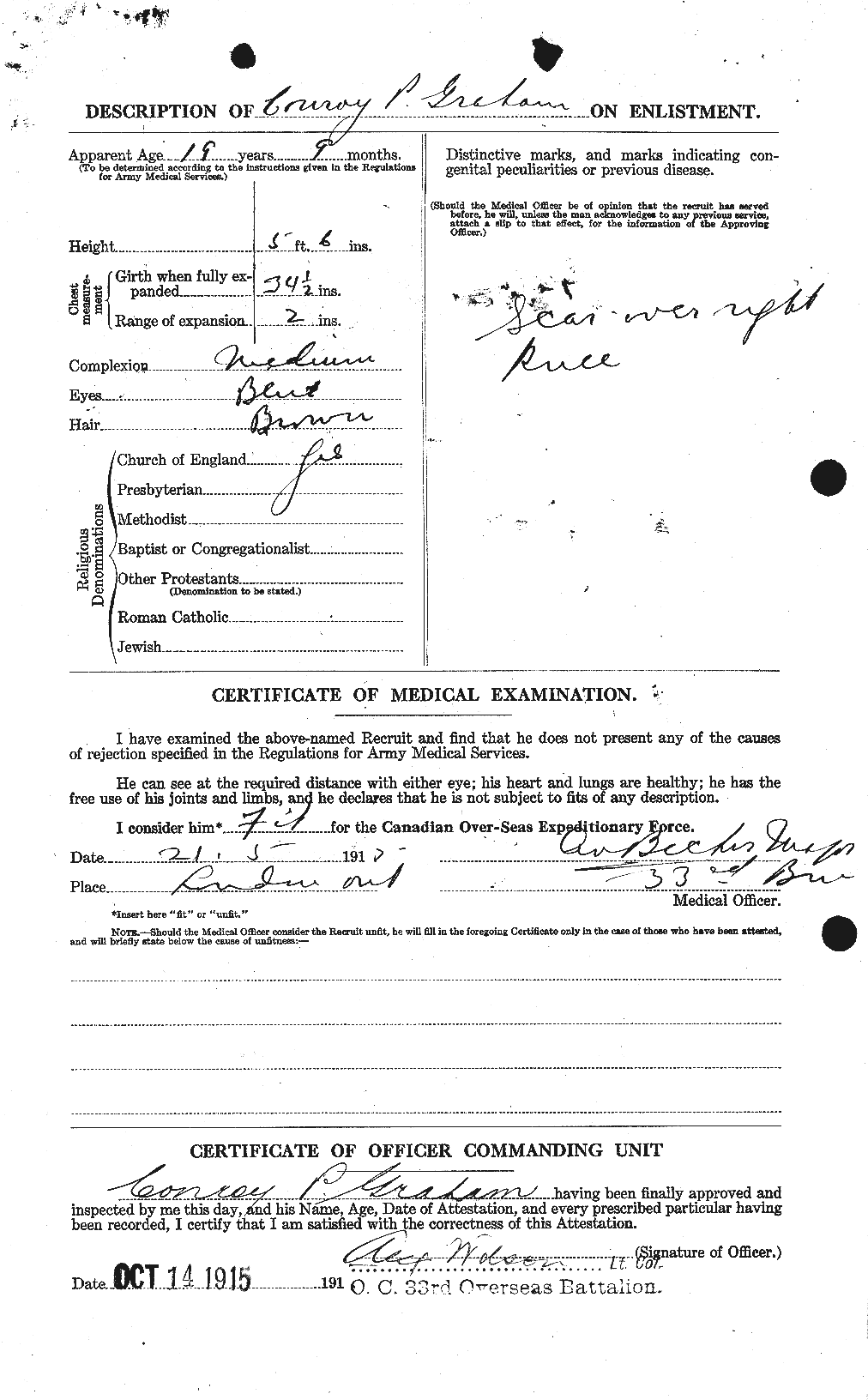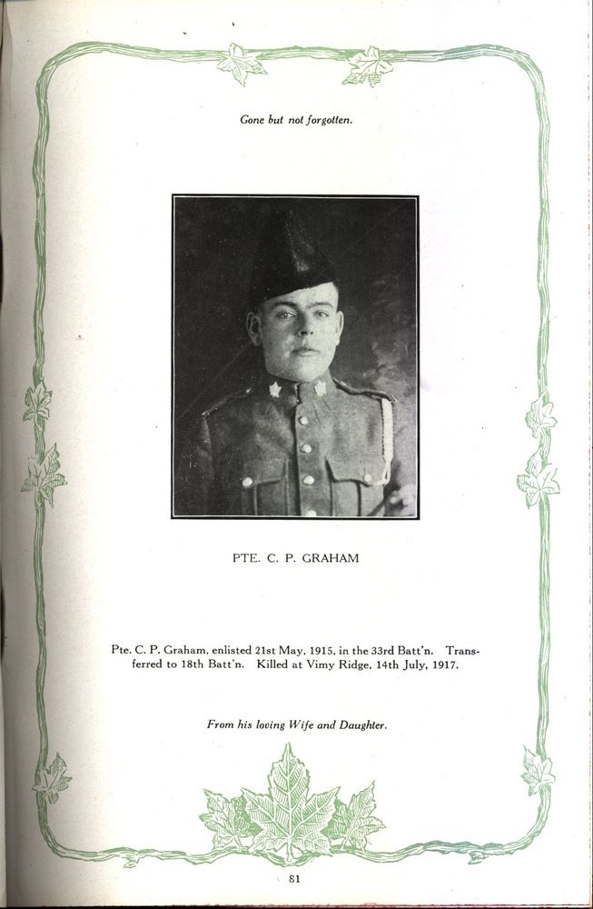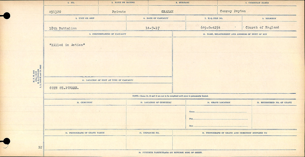 Family Search: Private Conroy Peyton Graham was born on 6 August 1895, in Camberwell, London, England, United Kingdom. He married Sadie on 8 September 1915, in Ontario, Canada. He immigrated to Canada in 1915. He registered for military service in 1915. In 1915, at the age of 20, his occupation is listed as labourer in London, Ontario, Canada. He died on 14 July 1917, inear Lens, Pas-de-Calais, France, at the age of 21.