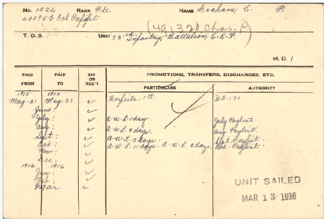 This man was initially with the 18th Battalion when it was formed in Fall 1914 but was discharged due to misconduct. He re-enlisted and married a woman with the first name of Sadie. Later service records shows he changed his assigned pay to his sister, a Mrs. M. Scrimshaw, living at 20 Fairholme Road, London, England.